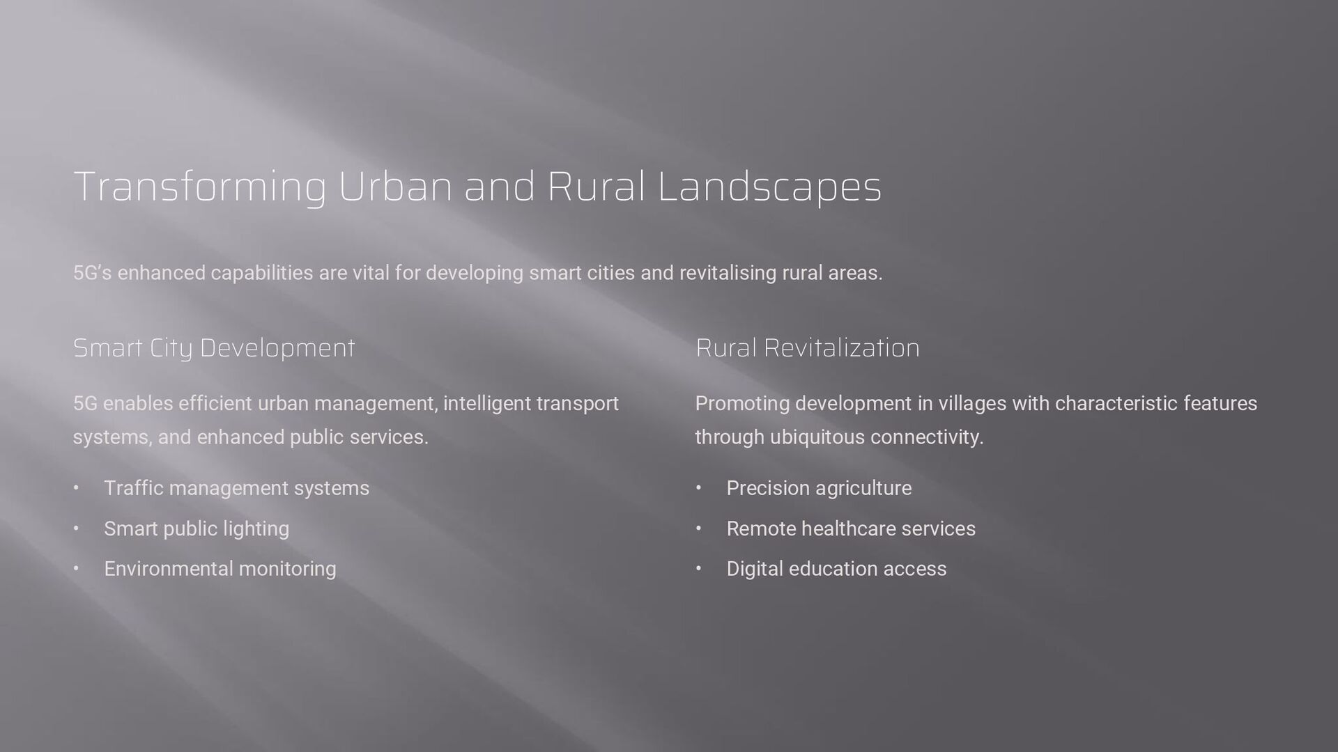 for developing smart cities and revitalising rural areas. Smart City Development 5G enables efficient urban management, intelligent transport systems, and enhanced public services. • Traffic management systems • Smart public lighting • Environmental monitoring Rural Revitalization Promoting development in villages with characteristic features through ubiquitous connectivity. • Precision agriculture • Remote healthcare services • Digital education access