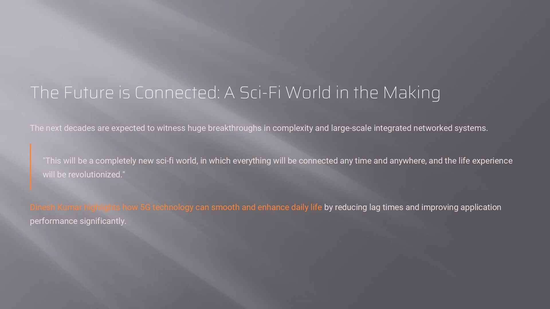 The next decades are expected to witness huge breakthroughs in complexity and large-scale integrated networked systems. "This will be a completely new sci-fi world, in which everything will be connected any time and anywhere, and the life experience will be revolutionized." Dinesh Kumar highlights how 5G technology can smooth and enhance daily life by reducing lag times and improving application performance significantly.