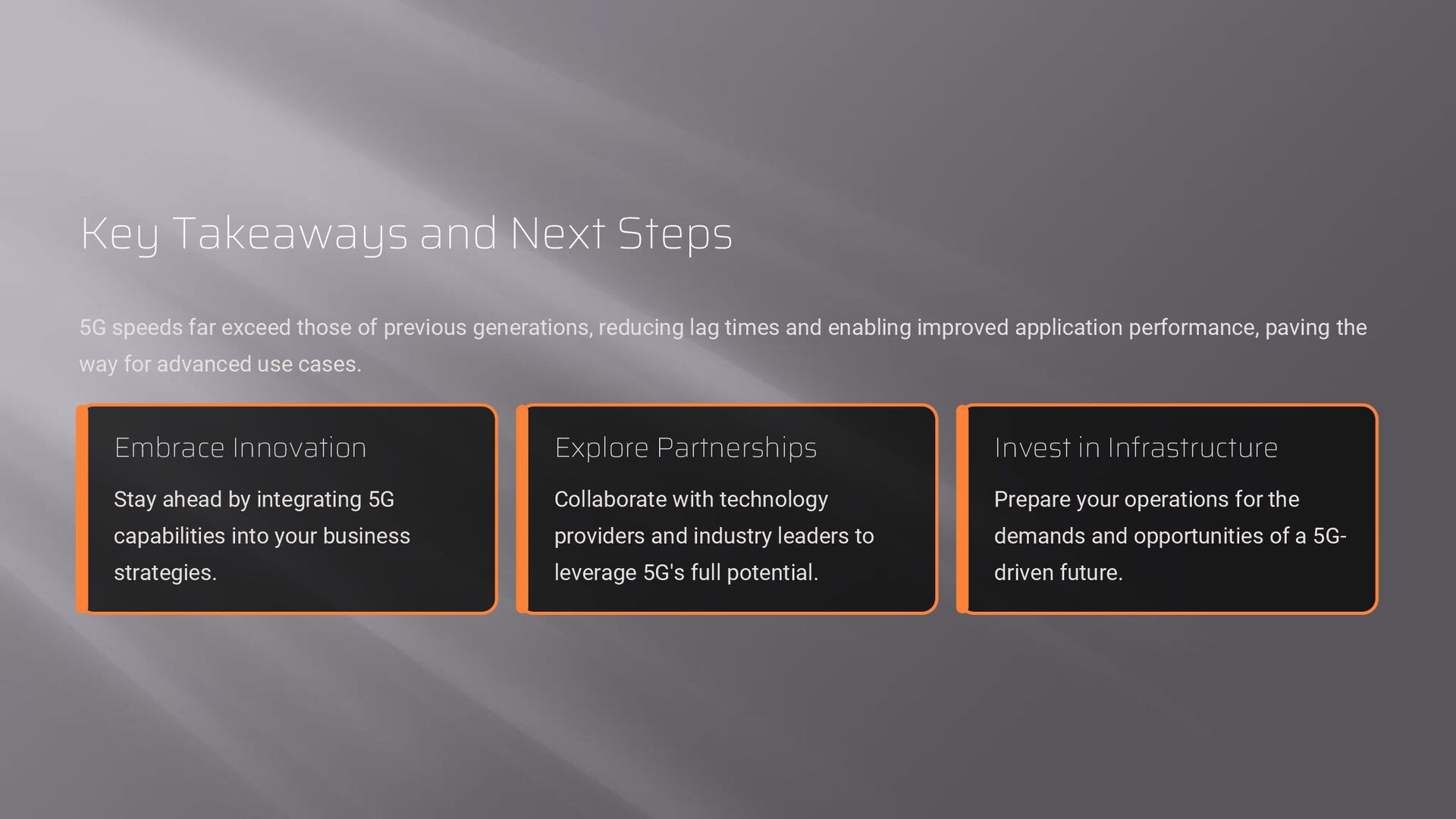of previous generations, reducing lag times and enabling improved application performance, paving the way for advanced use cases. Embrace Innovation Stay ahead by integrating 5G capabilities into your business strategies. Explore Partnerships Collaborate with technology providers and industry leaders to leverage 5G's full potential. Invest in Infrastructure Prepare your operations for the demands and opportunities of a 5G- driven future.