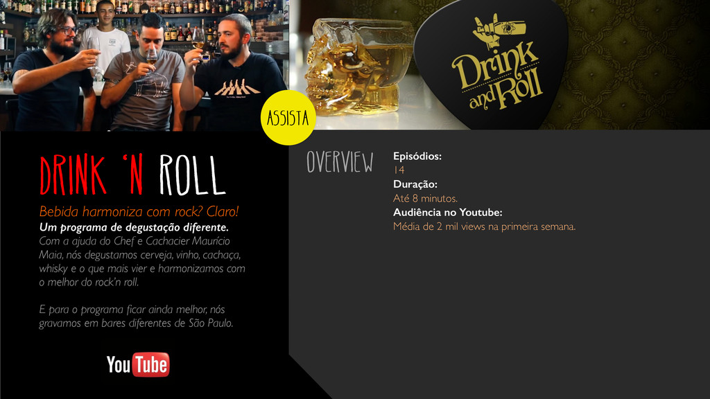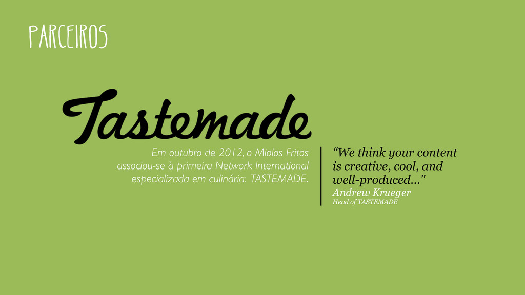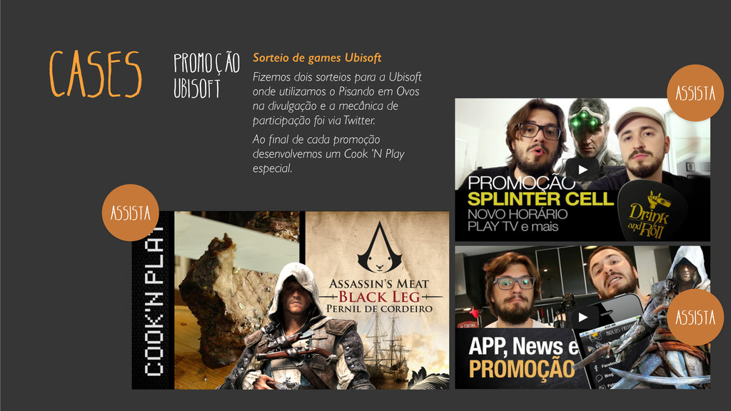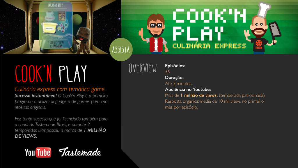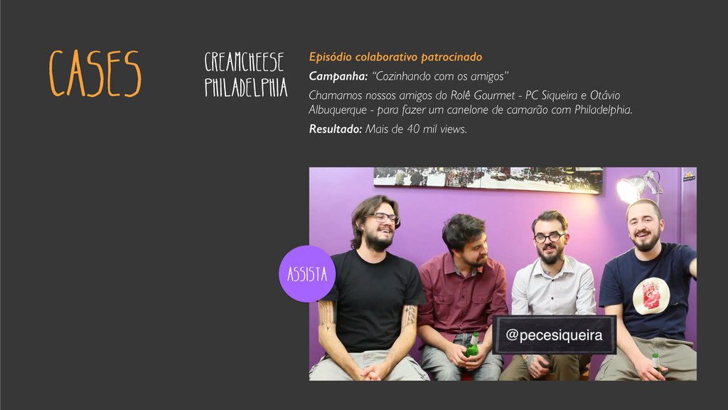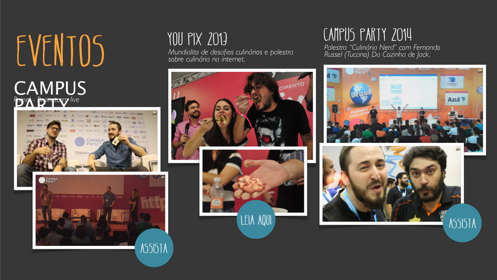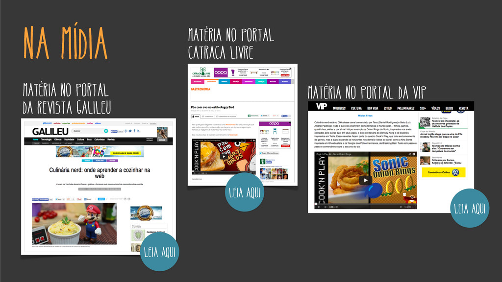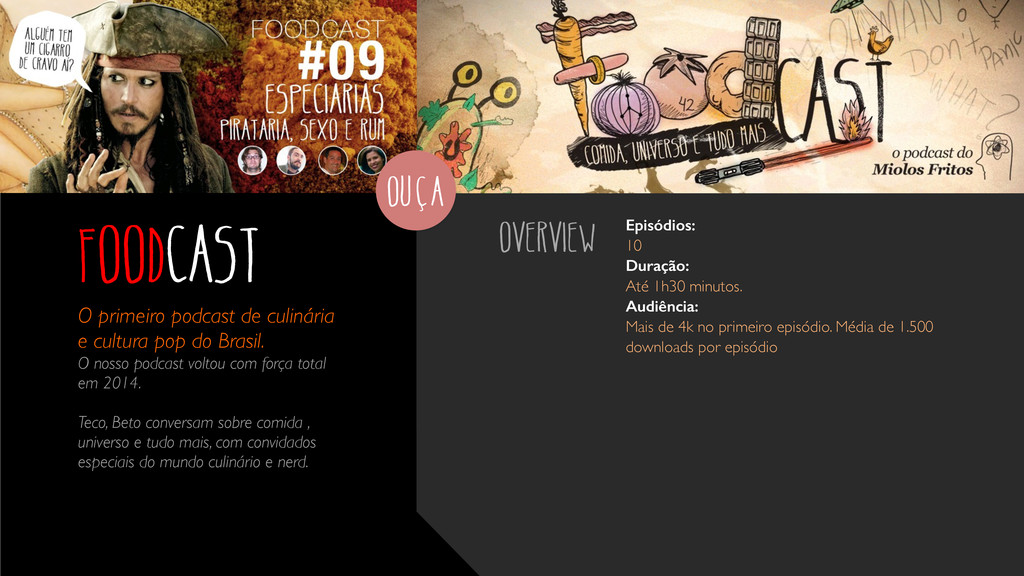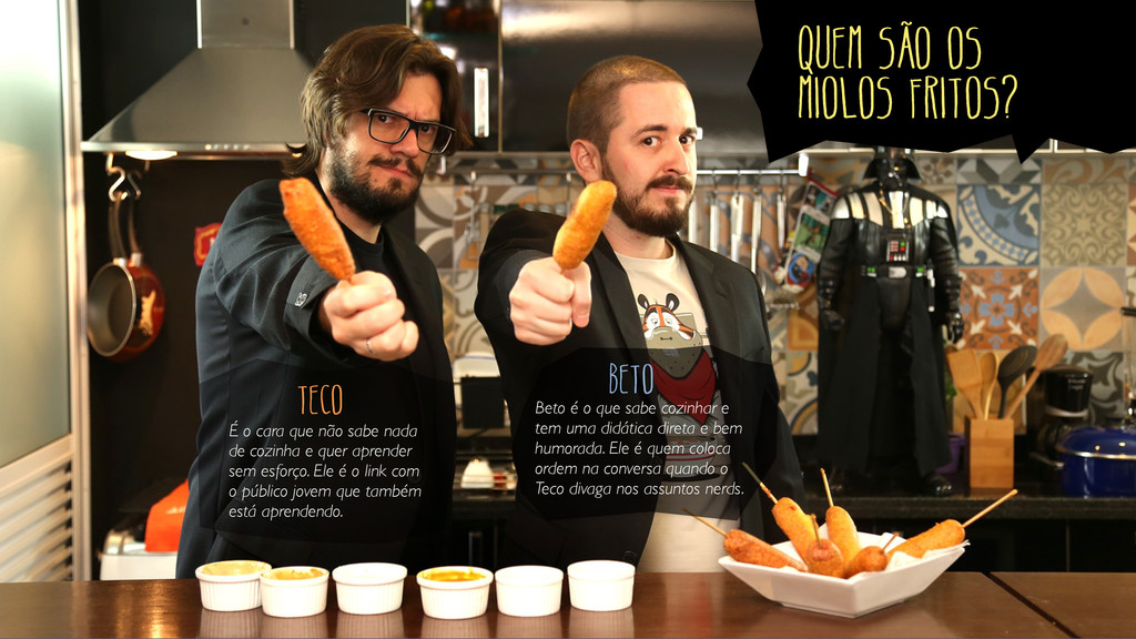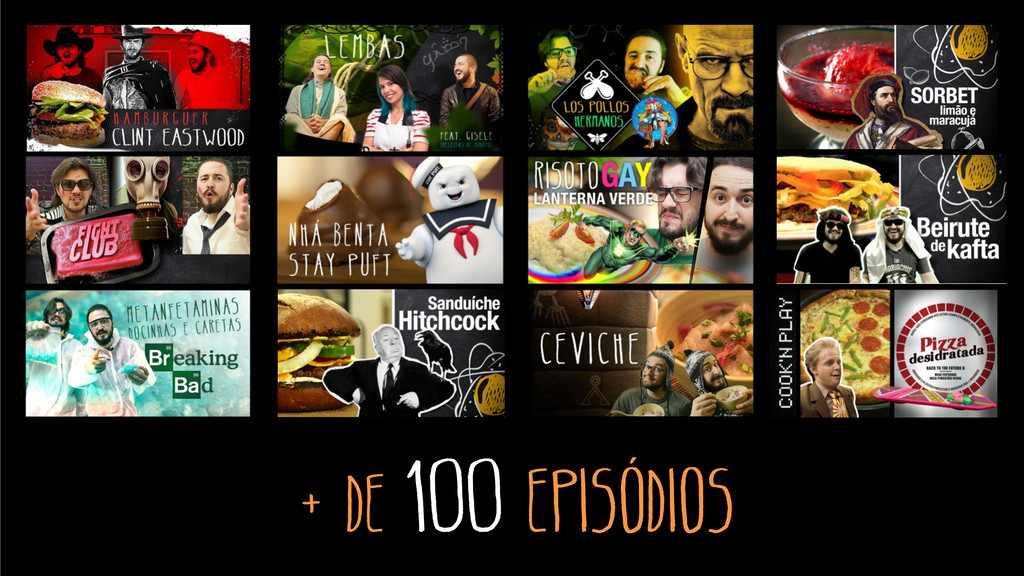 mas vamos listar aqui as mais comuns. Merchan direto/testemunhal Quando utilizamos seu produto ou serviço, falamos sobre os features e damos nossa opinião sincera. Merchan direto/testemunhal e product placement Além do testemunho e utilização, deixamos seu produto exposto durante o episódio. Vinheta/oferecimento Fazemos uma vinheta com locução bem bacana no início do episódio patrocinado. ex.: Lançamento TMNT - Paramount Especial exclusivo Um episódio lindo, só seu e de mais ninguém! ex.: Lançamento TMNT - Paramount Ao vivo e palestras Adoramos o contato com o público e modéstia a parte, somos bem simpáticos! ex.: Painéis e palestras realizadas no YouPix (2013, 2014), Campus Party (2013, 2014), livraria Mundo Gourmet e recentemente na Bienal do Livro. Especial com celebridade As vezes um pessoal famoso vem visitar nossa cozinha, e aí… quem cozinha são eles! ex.: Tucano do Jovem Nerd Post patrocinado Você pode enviar o conteúdo ou nós criamos para você. Pode ser texto e foto, texto e vídeo, texto e podcast… go crazy! Banner na home e barra lateral Com tanta coisa legal, você não vai querer ficar só nisso né? Mas se quiser, fazemos também! Redes sociais Tudo isso, impulsionado pelas nossa redes sociais (Facebook, Twitter e Instagram).