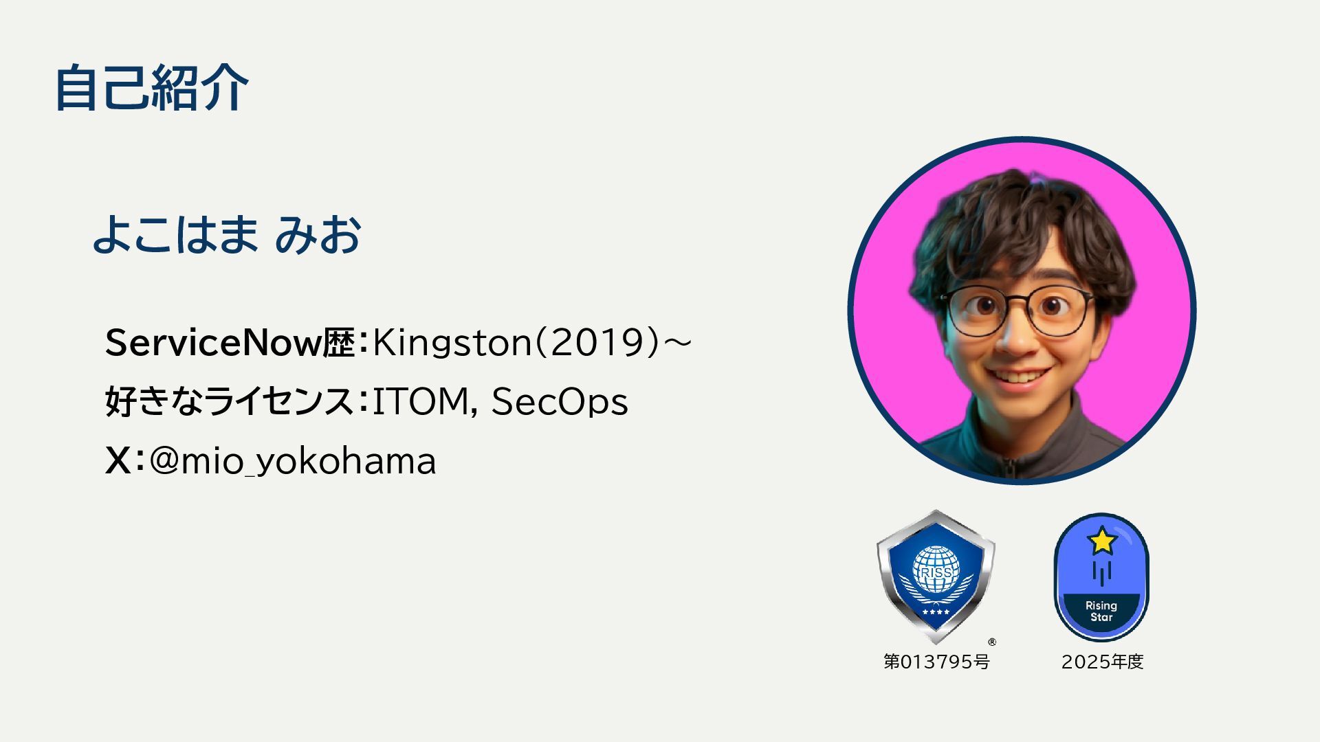 自己紹介 ServiceNow歴:Kingston(2019)~ 好きなライセンス:ITOM, SecOps X:@mio_yokohama よこはま みお 第013795号 2025年度