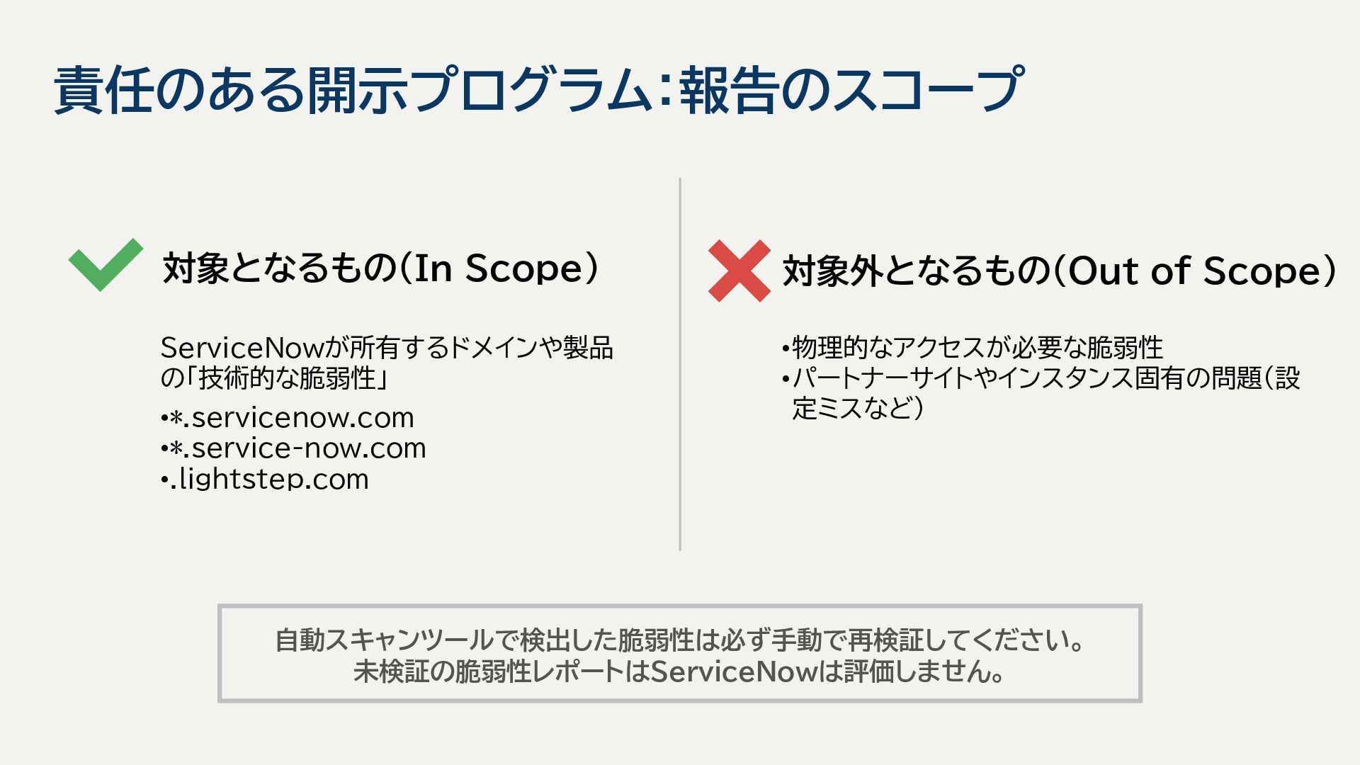 ServiceNowが所有するドメインや製品 の「技術的な脆弱性」 •*.servicenow.com •*.service-now.com •.lightstep.com 対象となるもの(In Scope) 対象外となるもの(Out of Scope)