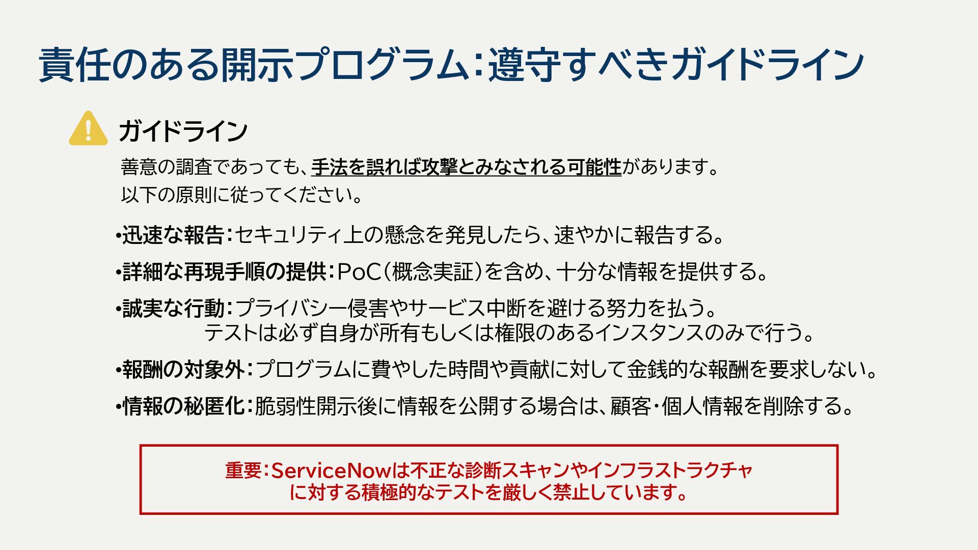 善意の調査であっても、手法を誤れば攻撃とみなされる可能性があります。 以下の原則に従ってください。 •迅速な報告:セキュリティ上の懸念を発見したら、速やかに報告する。 •詳細な再現手順の提供:PoC(概念実証)を含め、十分な情報を提供する。 •誠実な行動:プライバシー侵害やサービス中断を避ける努力を払う。 テストは必ず自身が所有もしくは権限のあるインスタンスのみで行う。 •報酬の対象外:プログラムに費やした時間や貢献に対して金銭的な報酬を要求しない。 •情報の秘匿化:脆弱性開示後に情報を公開する場合は、顧客・個人情報を削除する。 重要:ServiceNowは不正な診断スキャンやインフラストラクチャ に対する積極的なテストを厳しく禁止しています。