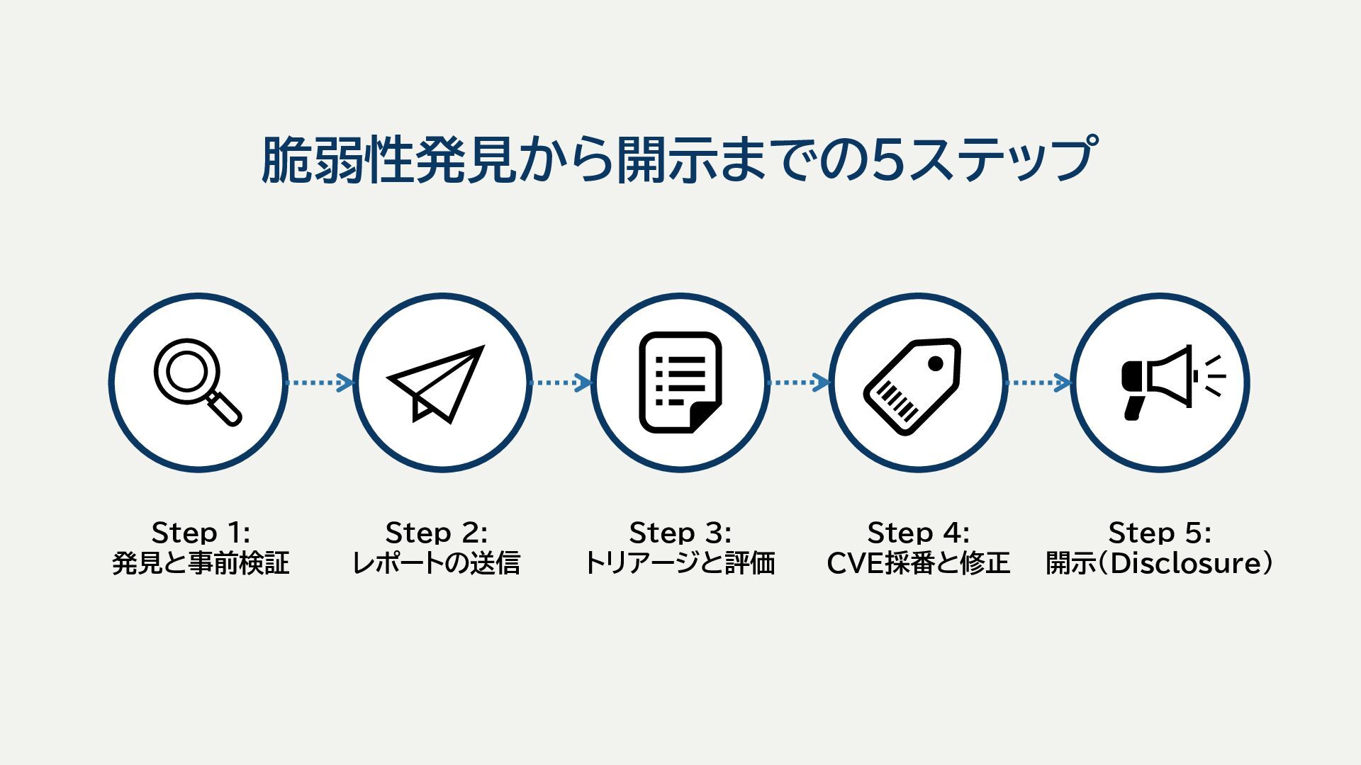 脆弱性発見から開示までの5ステップ Step 1: 発見と事前検証 Step 2: レポートの送信 Step 3: トリアージと評価