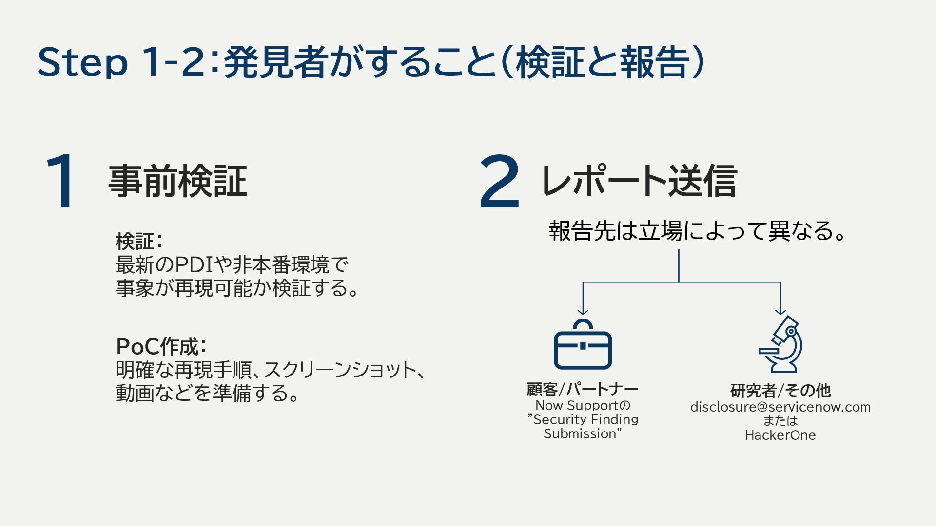 Step 1-2:発見者がすること(検証と報告) 1 事前検証 2 レポート送信 報告先は立場によって異なる。 検証: 最新のPDIや非本番環境で 事象が再現可能か検証する。