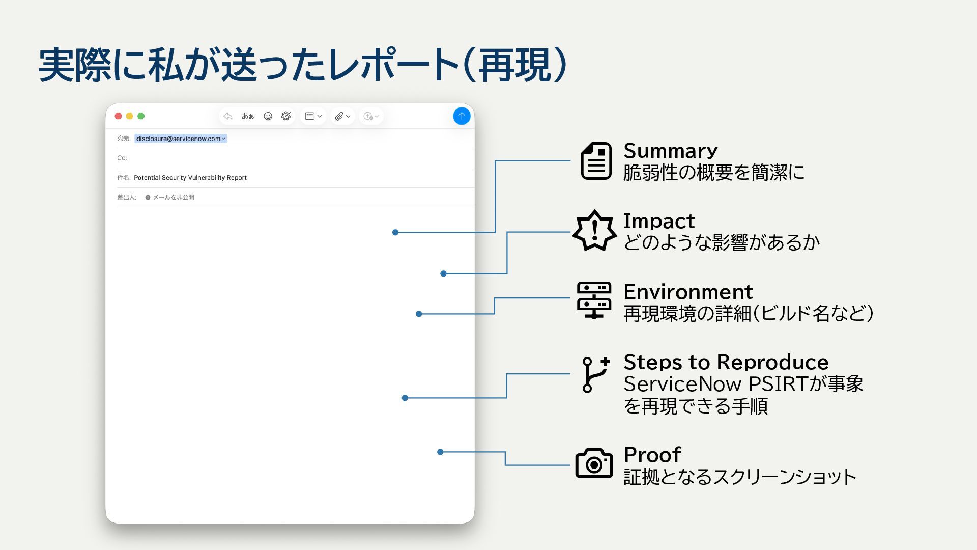 実際に私が送ったレポート(再現) Summary 脆弱性の概要を簡潔に Impact どのような影響があるか Environment 再現環境の詳細(ビルド名など) Steps to Reproduce