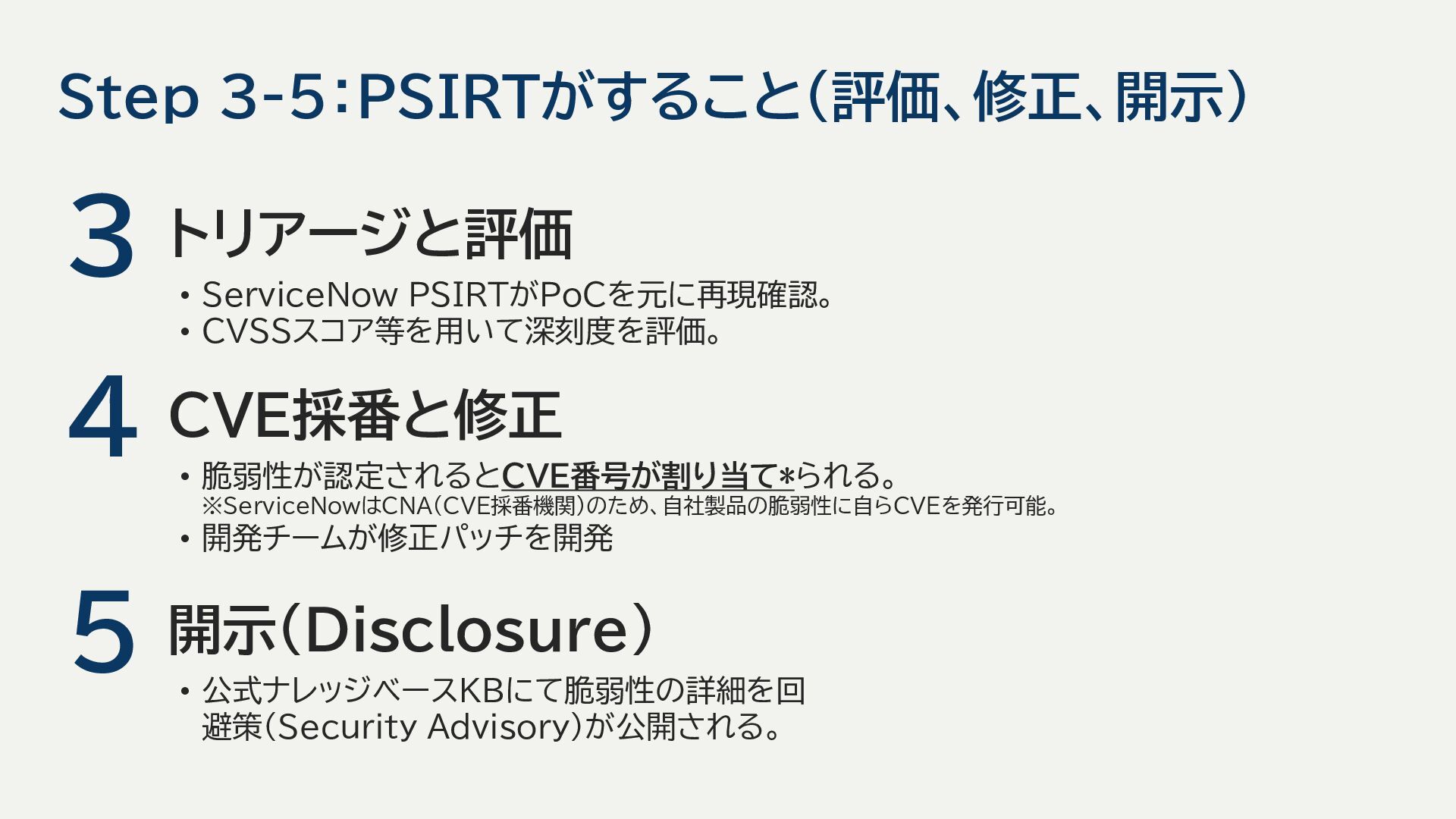 Step 3-5:PSIRTがすること(評価、修正、開示) 3 トリアージと評価 4 CVE採番と修正 • ServiceNow PSIRTがPoCを元に再現確認。 •