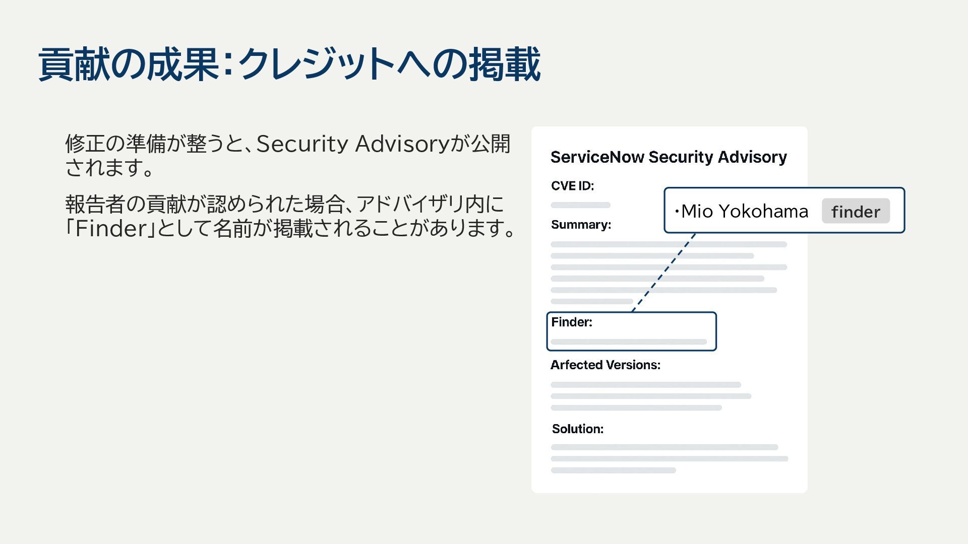 貢献の成果:クレジットへの掲載 修正の準備が整うと、Security Advisoryが公開 されます。 報告者の貢献が認められた場合、アドバイザリ内に 「Finder」として名前が掲載されることがあります。 ・Mio Yokohama finder