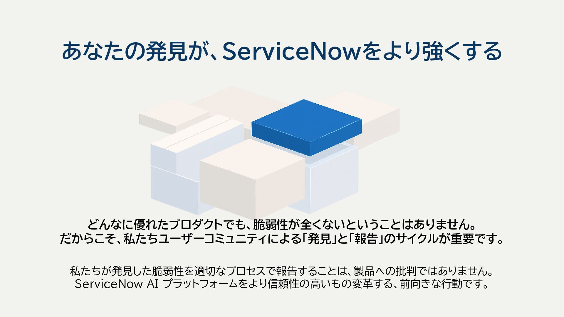 あなたの発見が、ServiceNowをより強くする どんなに優れたプロダクトでも、脆弱性が全くないということはありません。 だからこそ、私たちユーザーコミュニティによる「発見」と「報告」のサイクルが重要です。 私たちが発見した脆弱性を適切なプロセスで報告することは、製品への批判ではありません。 ServiceNow AI プラットフォームをより信頼性の高いもの変革する、前向きな行動です。