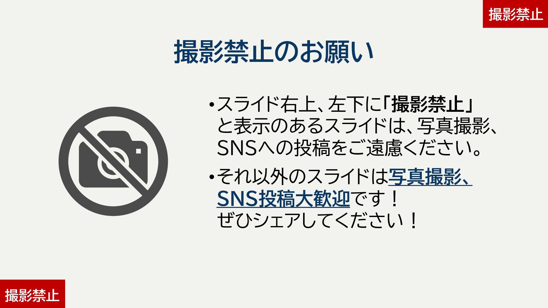 撮影禁止のお願い •スライド右上、左下に「撮影禁止」 と表示のあるスライドは、写真撮影、 SNSへの投稿をご遠慮ください。 •それ以外のスライドは写真撮影、 SNS投稿大歓迎です! ぜひシェアしてください! 撮影禁止 撮影禁止