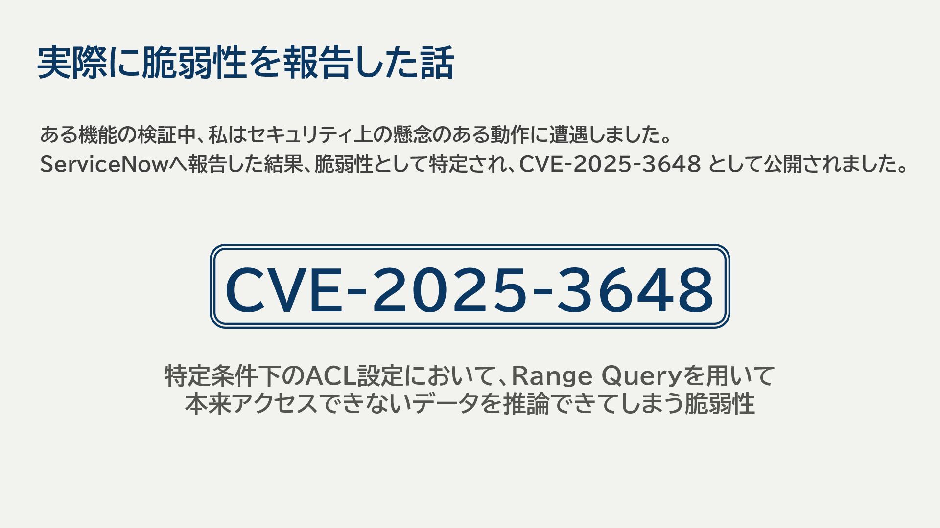 実際に脆弱性を報告した話 ある機能の検証中、私はセキュリティ上の懸念のある動作に遭遇しました。 ServiceNowへ報告した結果、脆弱性として特定され、CVE-2025-3648 として公開されました。 CVE-2025-3648 特定条件下のACL設定において、Range Queryを用いて 本来アクセスできないデータを推論できてしまう脆弱性