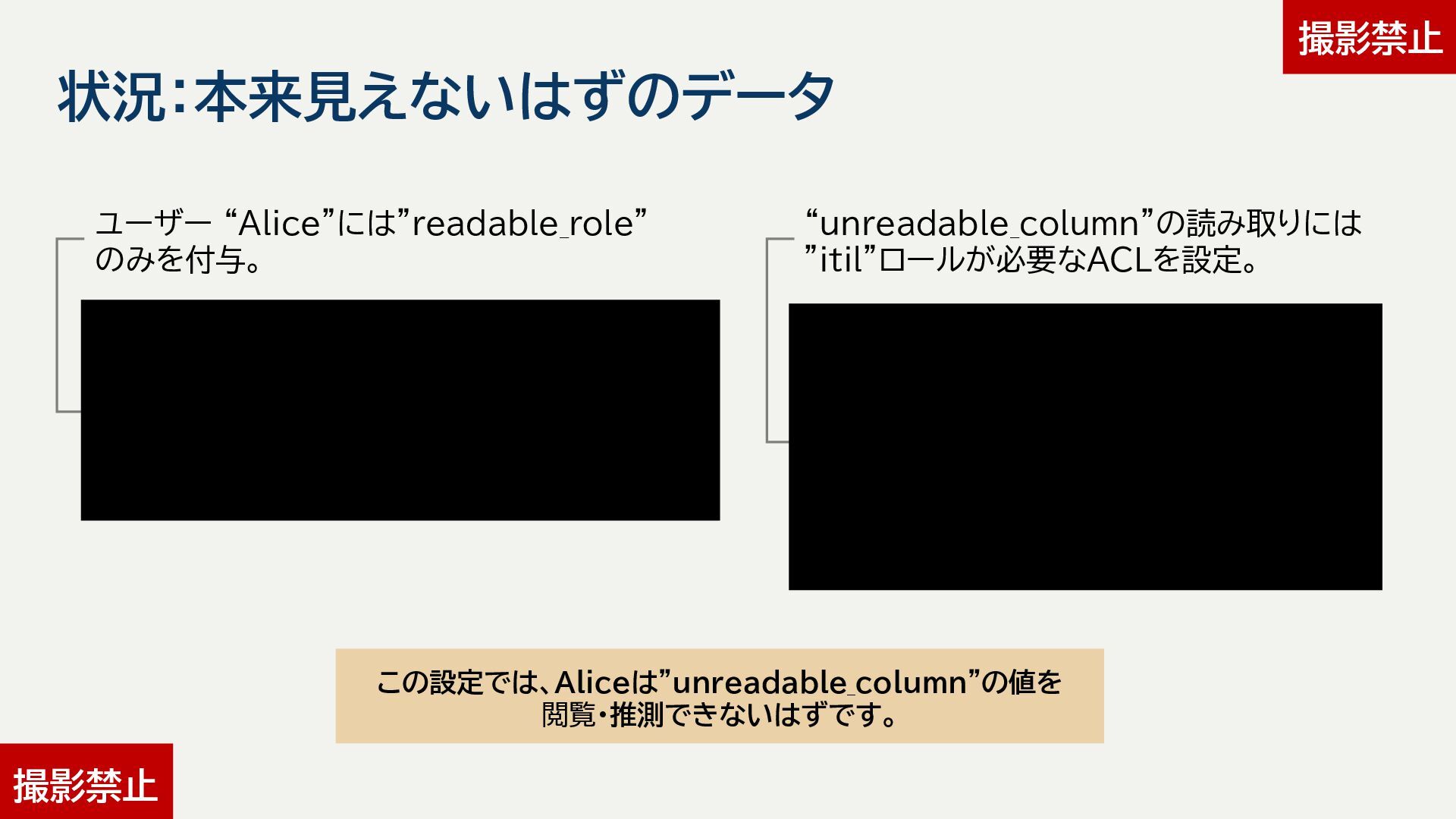 状況:本来見えないはずのデータ ユーザー “Alice”には”readable_role” のみを付与。 “unreadable_column”の読み取りには ”itil”ロールが必要なACLを設定。 この設定では、Aliceは”unreadable_column”の値を 閲覧・推測できないはずです。 撮影禁止 撮影禁止
