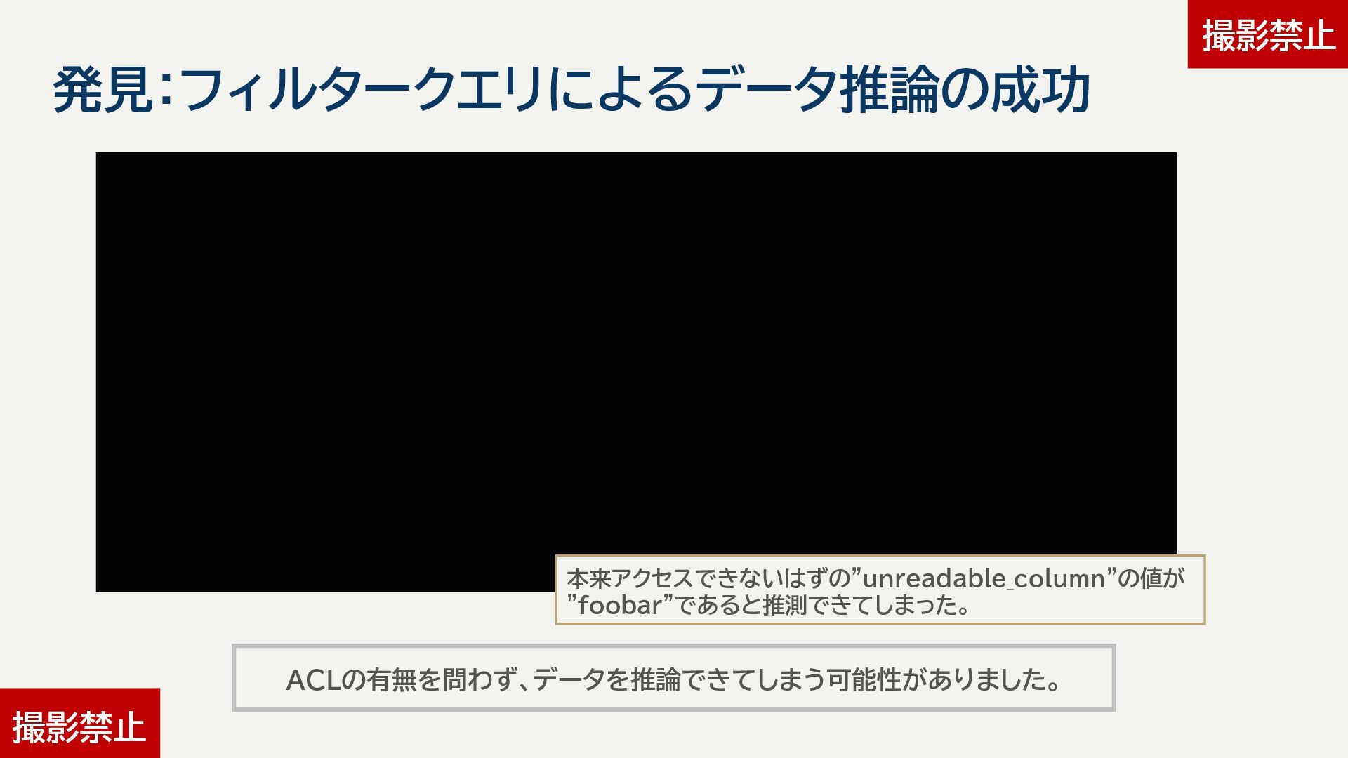 発見:フィルタークエリによるデータ推論の成功 ACLの有無を問わず、データを推論できてしまう可能性がありました。 しかし、特定のフィルター(read_column=foo^unreadable_column=foobar)を使うと… 撮影禁止 撮影禁止 本来アクセスできないはずの”unreadable_column”の値が ”foobar”であると推測できてしまった。