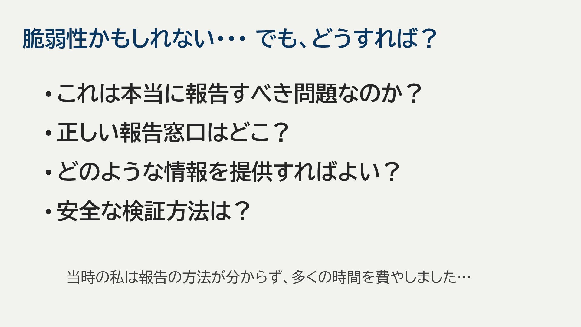 脆弱性かもしれない・・・ でも、どうすれば? • これは本当に報告すべき問題なのか? • 正しい報告窓口はどこ? • どのような情報を提供すればよい? • 安全な検証方法は?