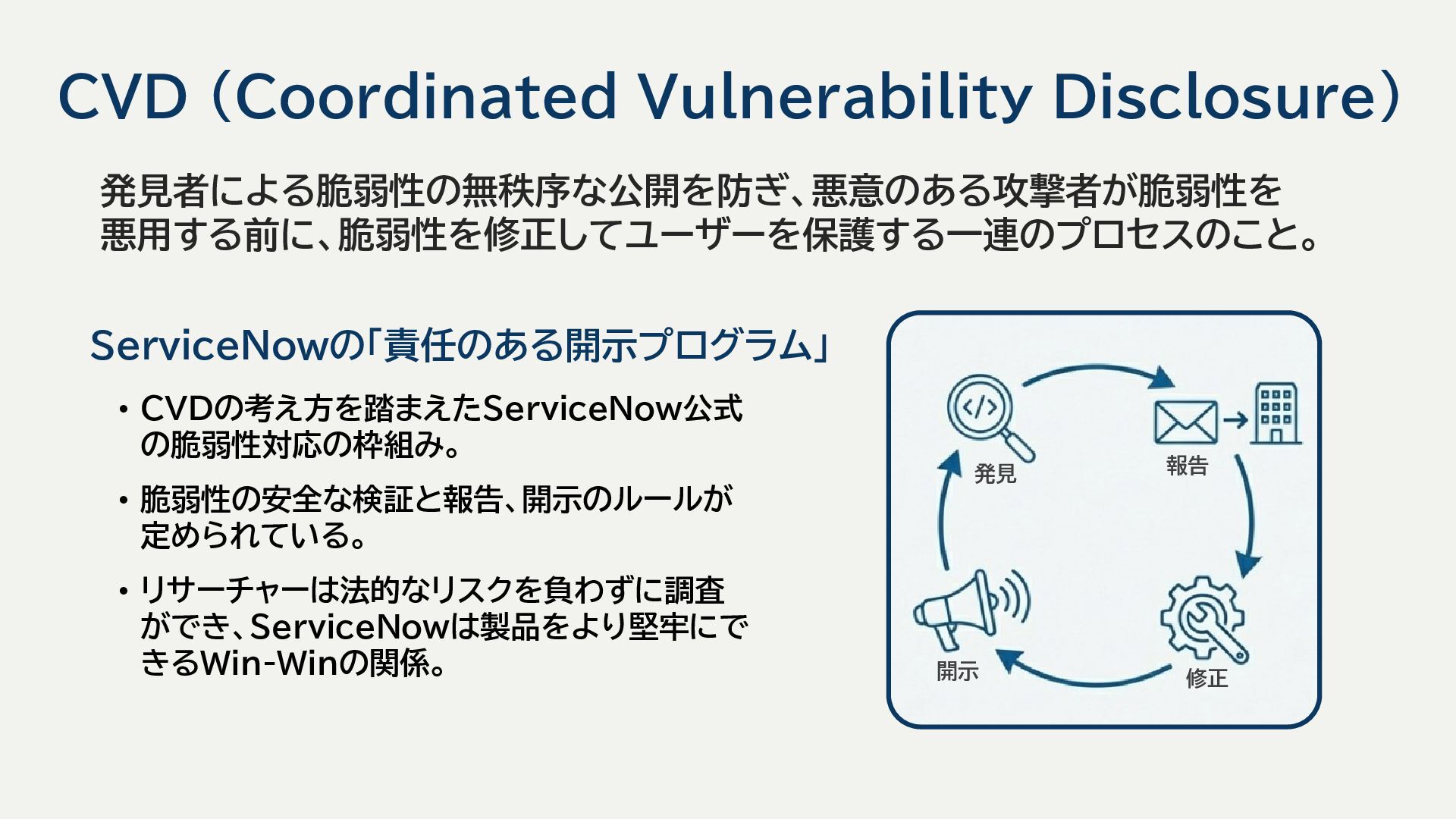 CVD (Coordinated Vulnerability Disclosure) 発見者による脆弱性の無秩序な公開を防ぎ、悪意のある攻撃者が脆弱性を 悪用する前に、脆弱性を修正してユーザーを保護する一連のプロセスのこと。 • CVDの考え方を踏まえたServiceNow公式 の脆弱性対応の枠組み。 •