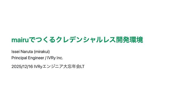 mairuでつくるクレデンシャルレス開発環境 Issei Naruta (mirakui) Principal Engineer / IVRy Inc. 2025/12/16