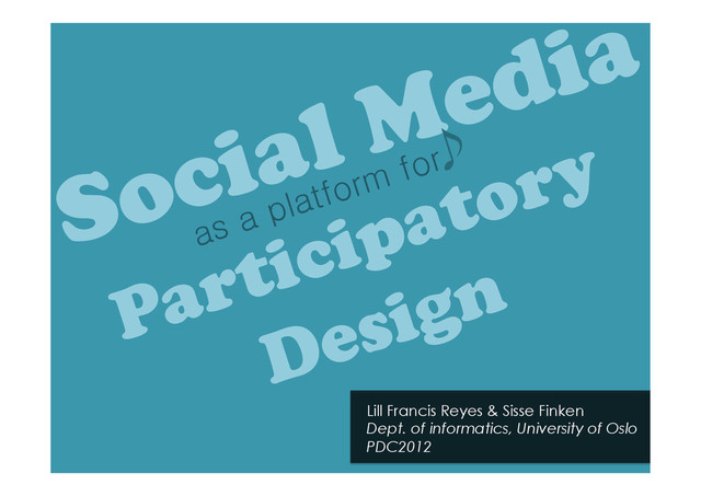 A talk about my published paper for the Participatory Design Conference 2012 in Roskilde. I reflect on my research on using Social media as a platform for executing a Participatory design process, and how this process raised questions of emancipation, silence, and degrees of participation.