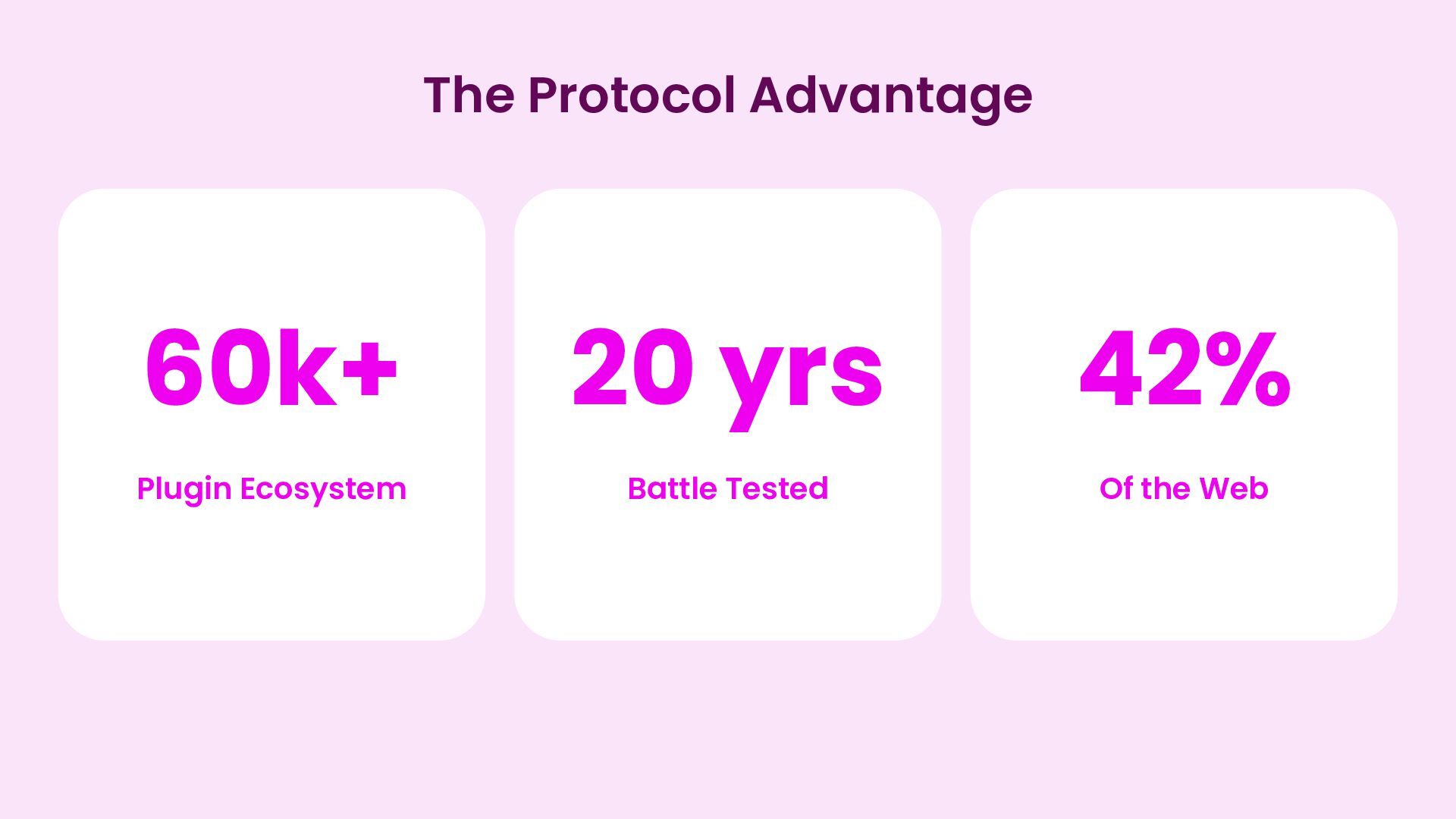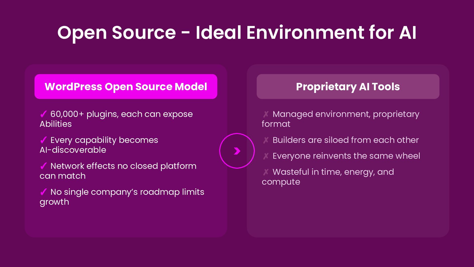 Model ✓ 60,000+ plugins, each can expose Abilities ✓ Every capability becomes AI-discoverable ✓ Network effects no closed platform can match ✓ No single company’s roadmap limits growth > Proprietary AI Tools ✗ Managed environment, proprietary format ✗ Builders are siloed from each other ✗ Everyone reinvents the same wheel ✗ Wasteful in time, energy, and compute