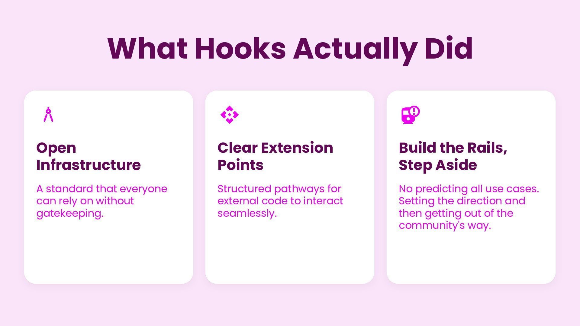 everyone can rely on without gatekeeping.  Clear Extension Points Structured pathways for external code to interact seamlessly.  Build the Rails, Step Aside No predicting all use cases. Setting the direction and then getting out of the community's way.