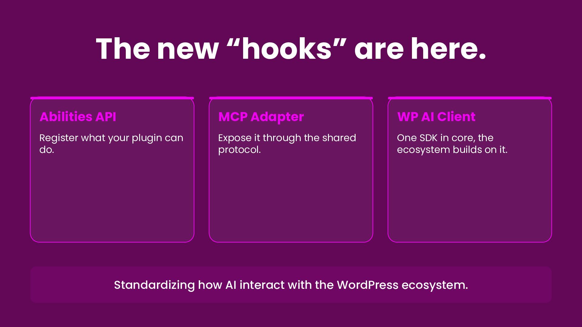 plugin can do. MCP Adapter Expose it through the shared protocol. WP AI Client One SDK in core, the ecosystem builds on it. Standardizing how AI interact with the WordPress ecosystem.
