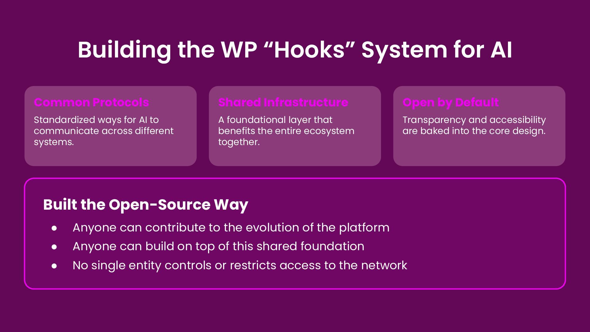 The WordPress core AI team is doing exactly this again. The Abilities API, the MCP Adapter, and the WP AI Client — shipping in WordPress 6.9 and 7.0 — are the hooks system for AI. And the open-source culture that made the plugin ecosystem what it is gives WordPress a structural advantage that no closed AI platform can replicate.