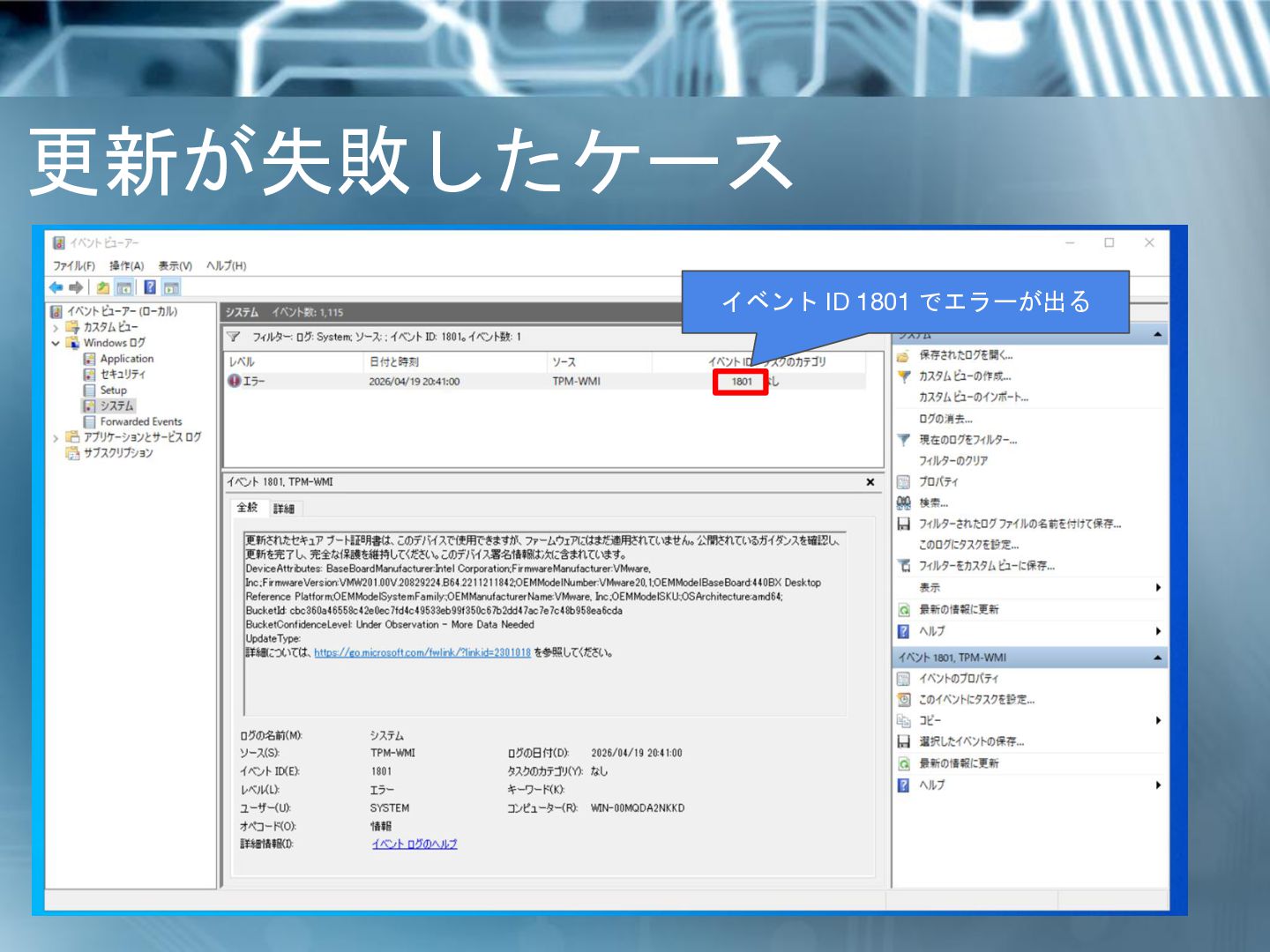 8. セキュアブート証明書更新失敗の影響 • 今のところはイベントログに 1801 で失敗が記録されるだけ ◦ 管理者側で Microsoft へ問い合わせが発生している…かも? •