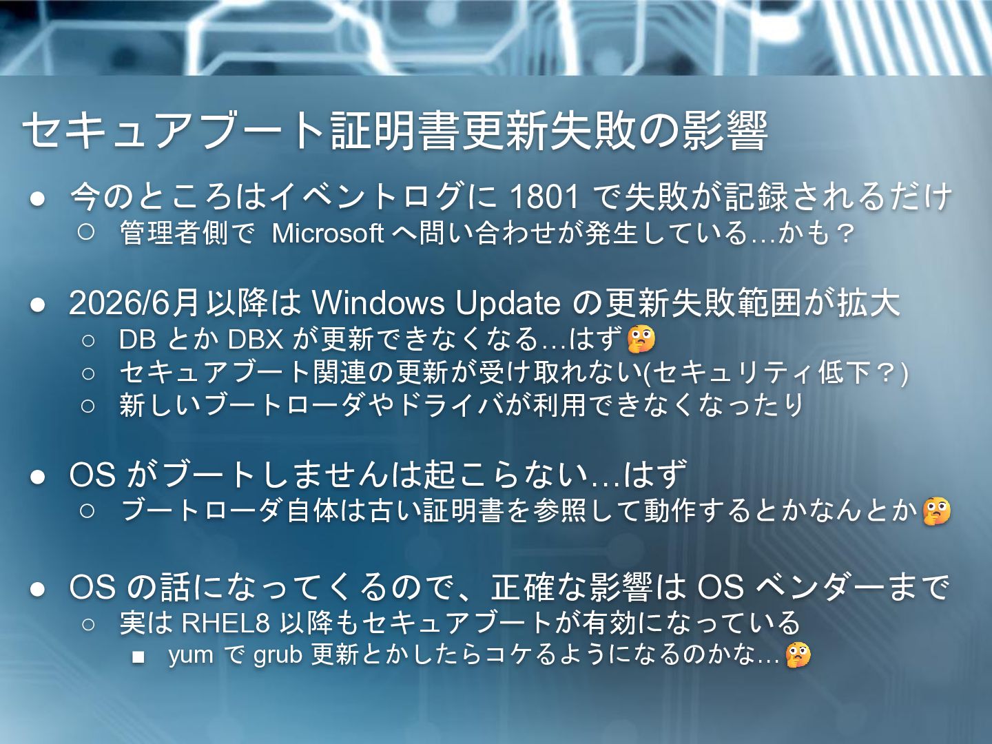 2026/6月以降は Windows Update の更新失敗範囲が拡大 ◦ DB とか DBX が更新できなくなる…はず ◦ セキュアブート関連の更新が受け取れない(セキュリティ低下?) ◦ 新しいブートローダやドライバが利用できなくなったり • OS がブートしませんは起こらない…はず ◦ ブートローダ自体は古い証明書を参照して動作するとかなんとか • OS の話になってくるので、正確な影響は OS ベンダーまで ◦ 実は RHEL8 以降もセキュアブートが有効になっている ▪ yum で grub 更新とかしたらコケるようになるのかな…