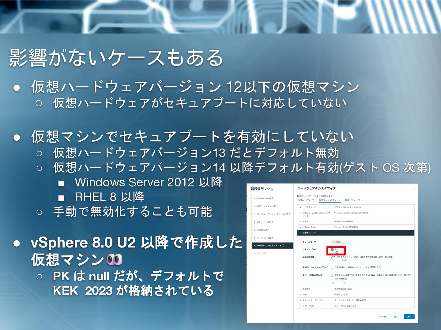 だとデフォルト無効 ◦ 仮想ハードウェアバージョン14 以降デフォルト有効(ゲスト OS 次第) ▪ Windows Server 2012 以降 ▪ RHEL 8 以降 ◦ 手動で無効化することも可能 • vSphere 8.0 U2 以降で作成した 仮想マシン ◦ PK は null だが、デフォルトで KEK 2023 が格納されている
