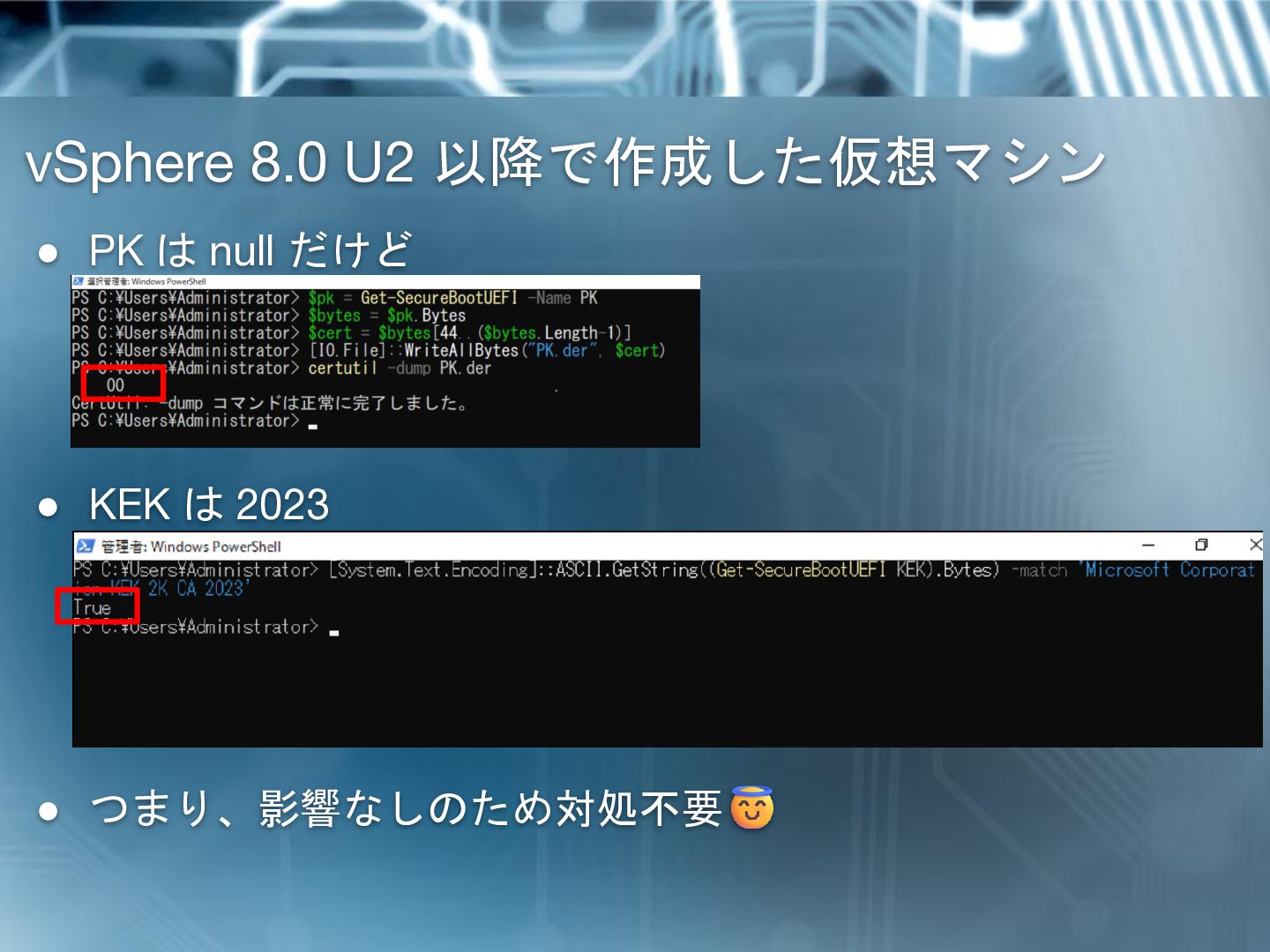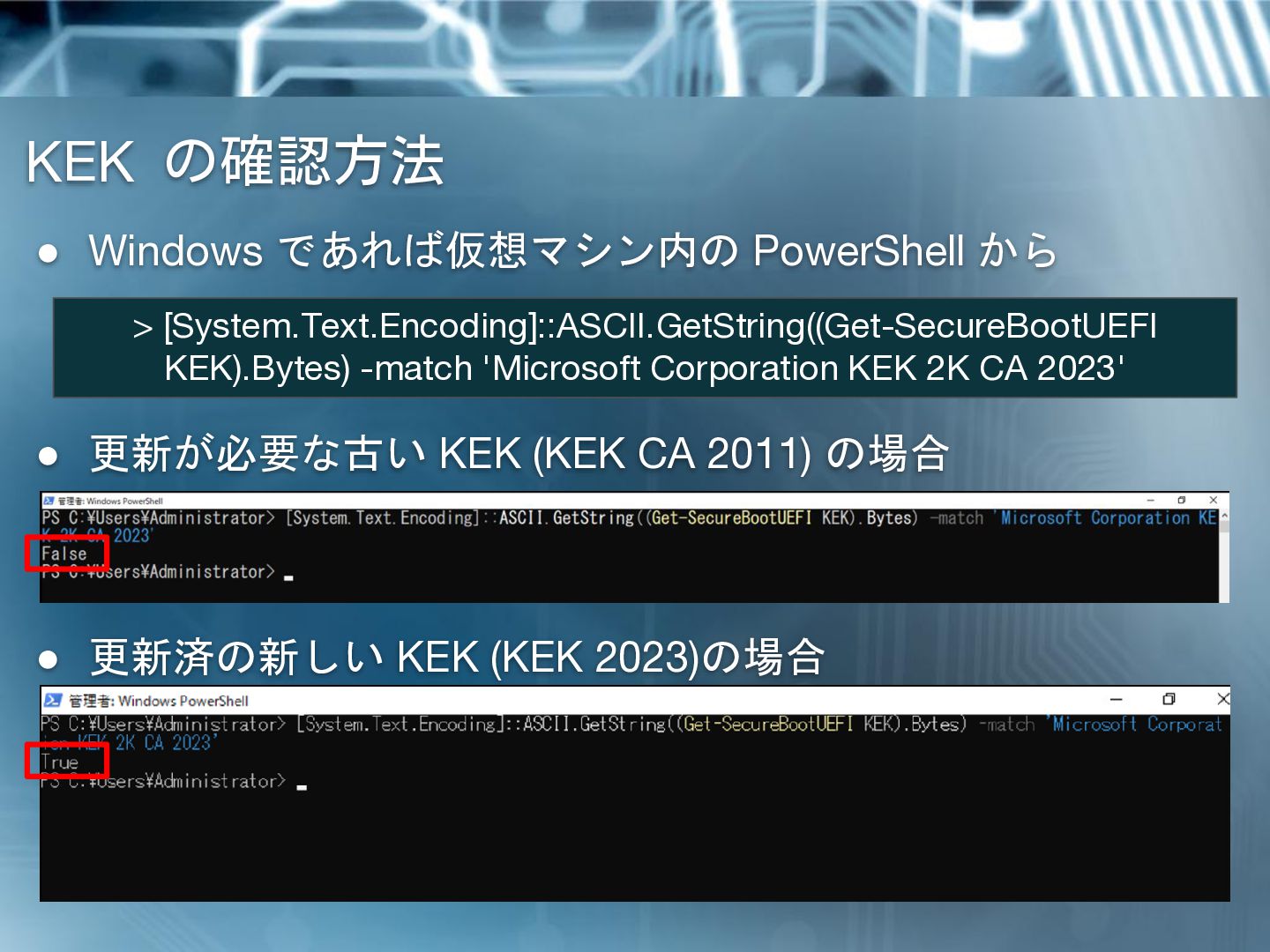 (KEK CA 2011) の場合 • 更新済の新しい KEK (KEK 2023)の場合 > [System.Text.Encoding]::ASCII.GetString((Get-SecureBootUEFI KEK).Bytes) -match 'Microsoft Corporation KEK 2K CA 2023'