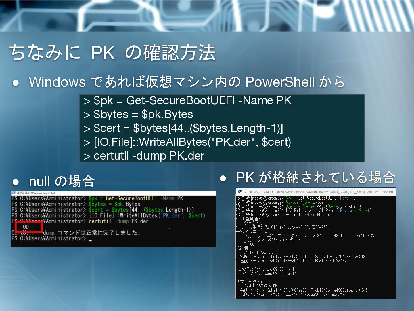 の場合 > $pk = Get-SecureBootUEFI -Name PK > $bytes = $pk.Bytes > $cert = $bytes[44..($bytes.Length-1)] > [IO.File]::WriteAllBytes("PK.der", $cert) > certutil -dump PK.der • PK が格納されている場合