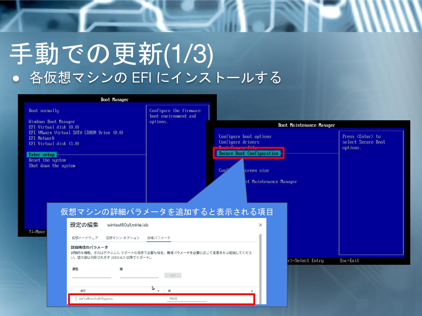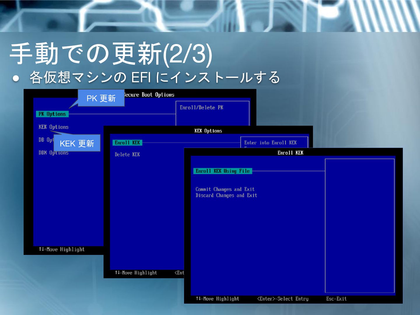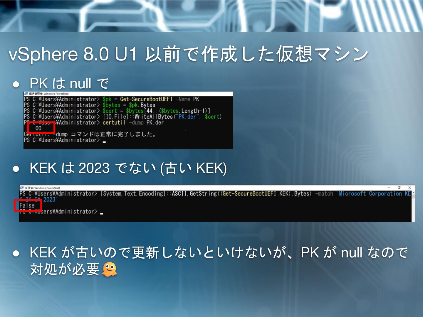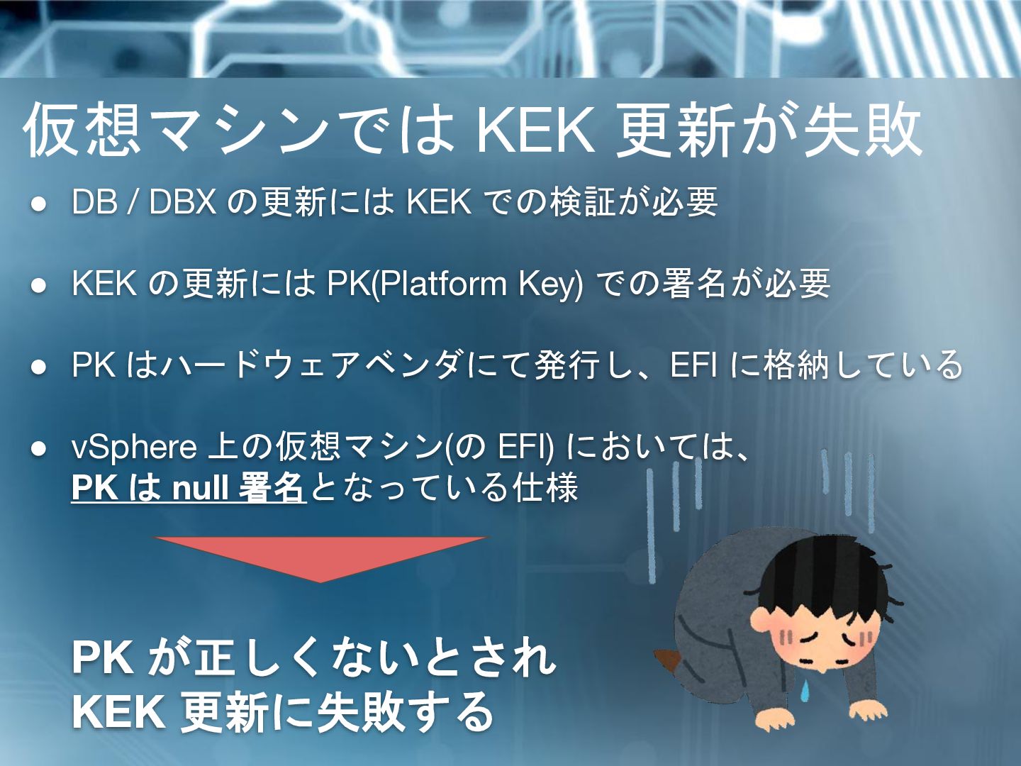 • KEK の更新には PK(Platform Key) での署名が必要 • PK はハードウェアベンダにて発行し、EFI に格納している • vSphere 上の仮想マシン(の EFI) においては、 PK は null 署名となっている仕様 PK が正しくないとされ KEK 更新に失敗する