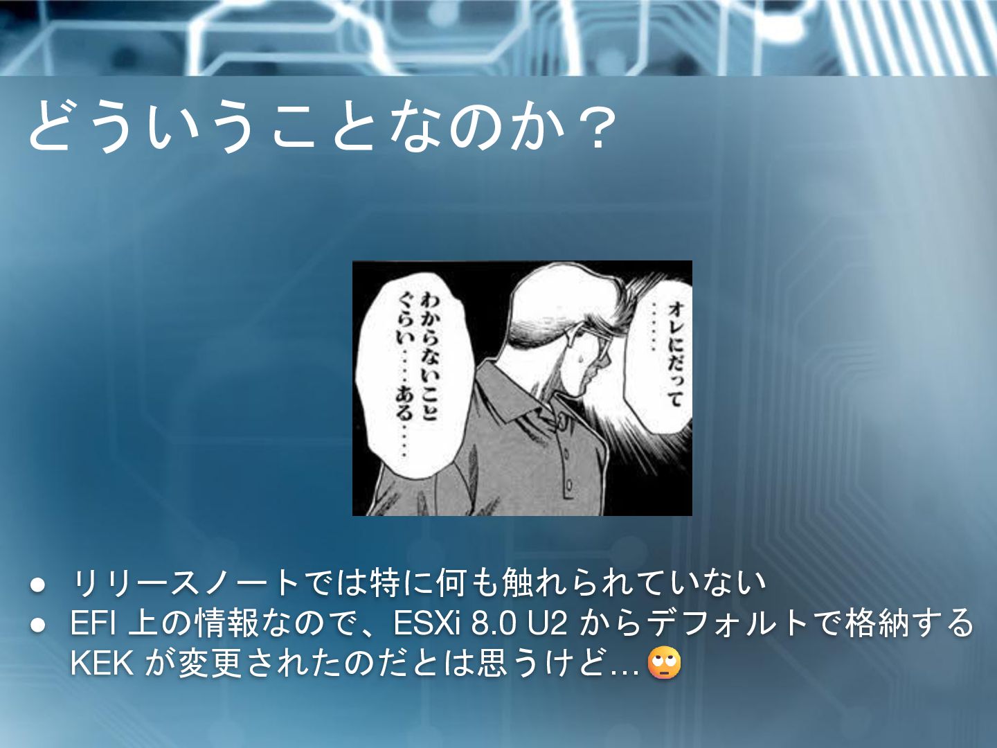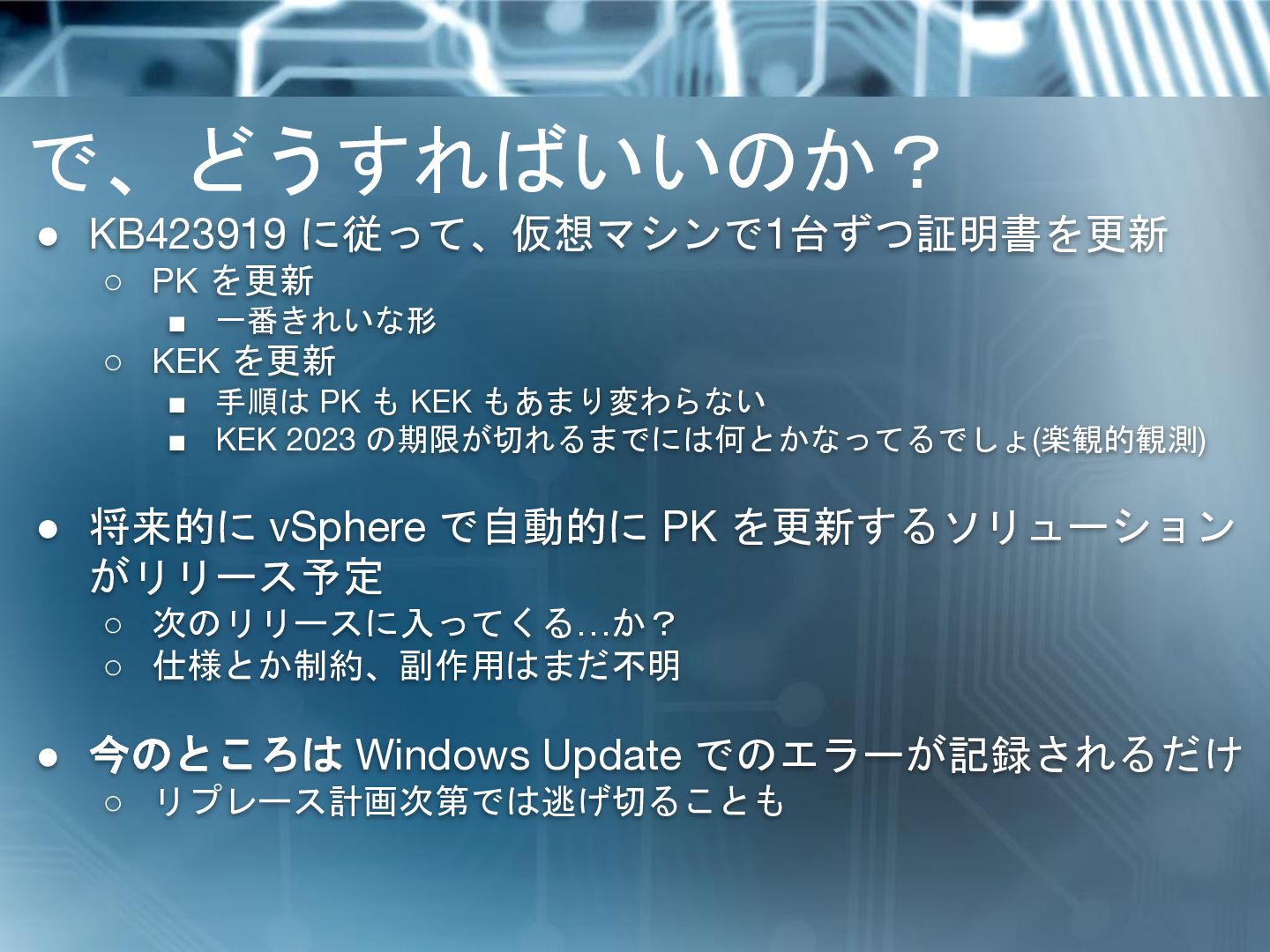 KEK を更新 ▪ 手順は PK も KEK もあまり変わらない ▪ KEK 2023 の期限が切れるまでには何とかなってるでしょ(楽観的観測) • 将来的に vSphere で自動的に PK を更新するソリューション がリリース予定 ◦ 次のリリースに入ってくる…か? ◦ 仕様とか制約、副作用はまだ不明 • 今のところは Windows Update でのエラーが記録されるだけ ◦ リプレース計画次第では逃げ切ることも