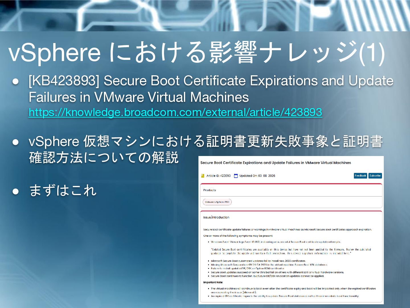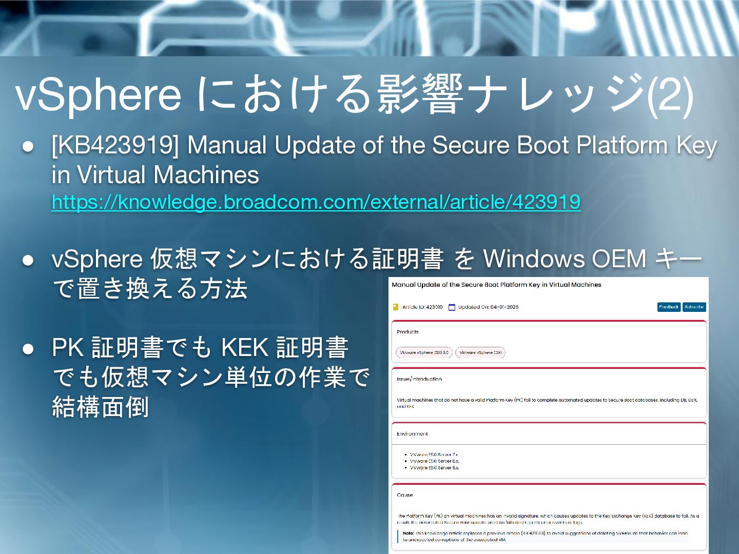 in Virtual Machines https://knowledge.broadcom.com/external/article/423919 • vSphere 仮想マシンにおける証明書 を Windows OEM キー で置き換える方法 • PK 証明書でも KEK 証明書 でも仮想マシン単位の作業で 結構面倒 vSphere における影響ナレッジ(2)