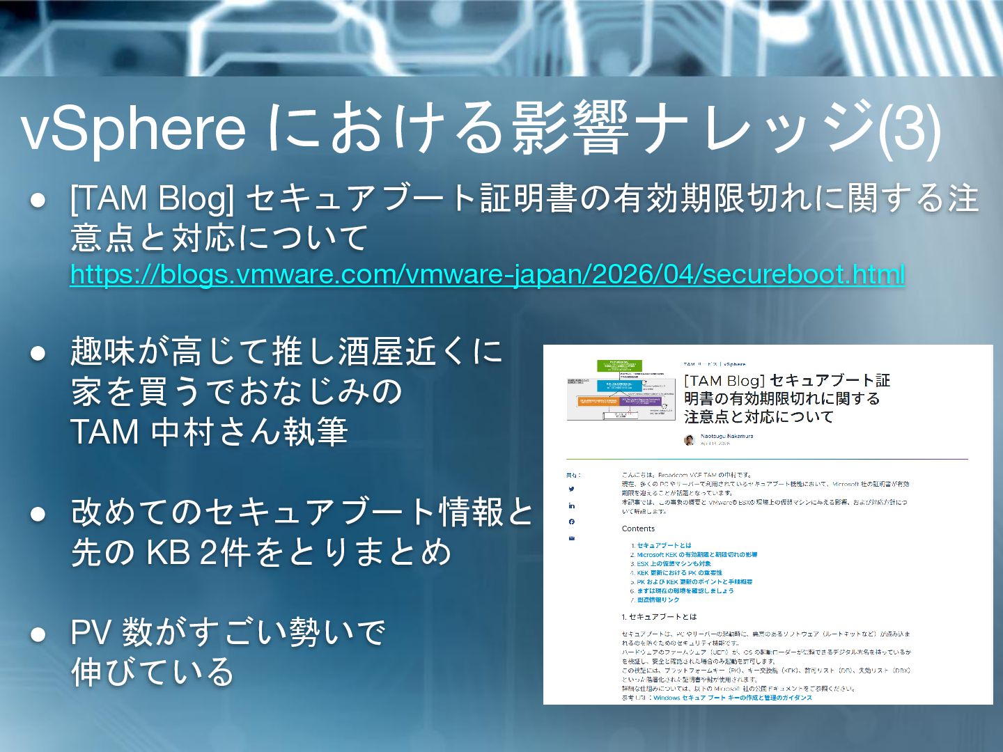 18. vSphere における影響ナレッジ(3) • [TAM Blog] セキュアブート証明書の有効期限切れに関する注 意点と対応について https://blogs.vmware.com/vmware-japan/2026/04/secureboot.html • 趣味が高じて推し酒屋近くに
