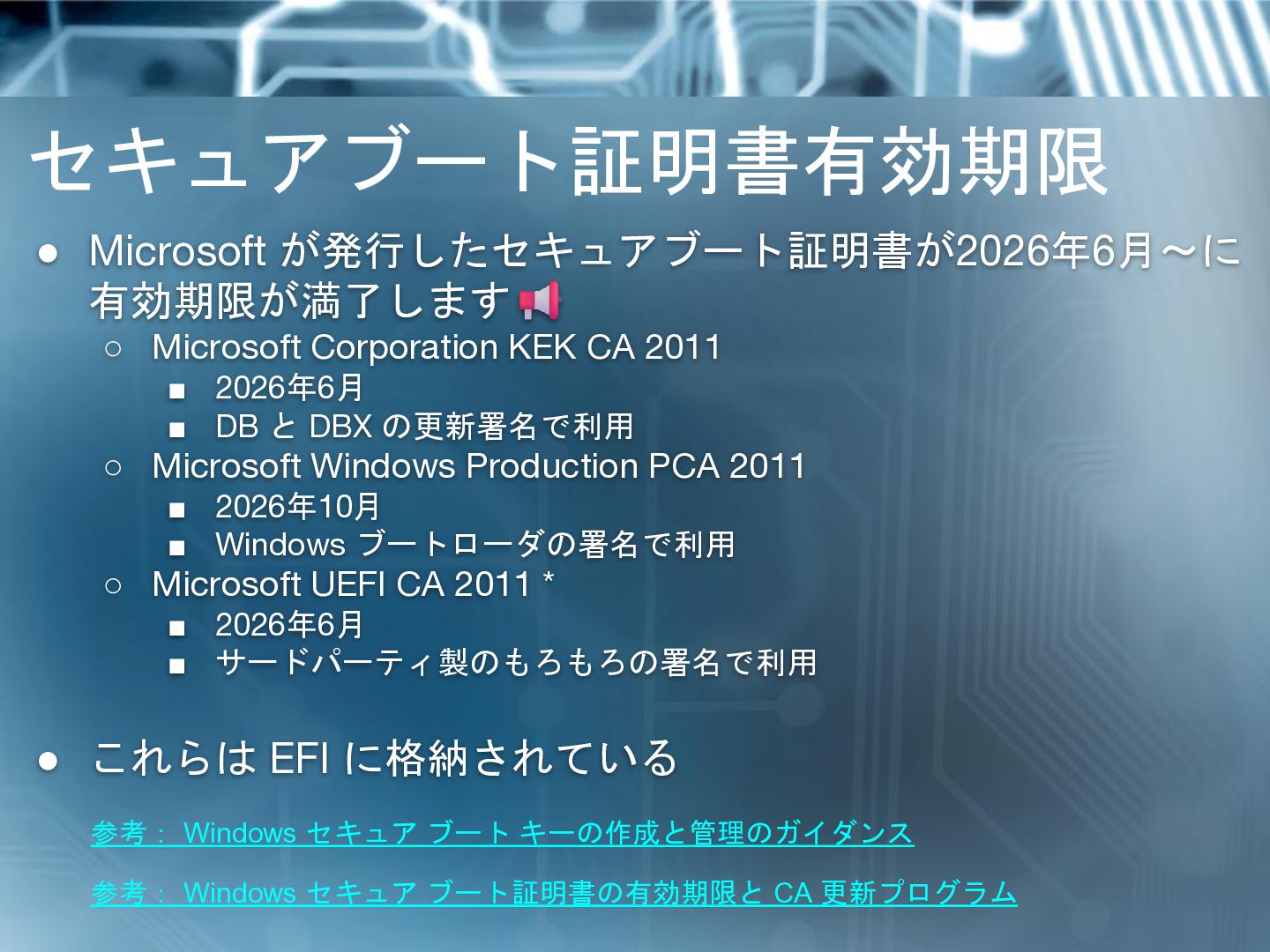 2011 ▪ 2026年6月 ▪ DB と DBX の更新署名で利用 ◦ Microsoft Windows Production PCA 2011 ▪ 2026年10月 ▪ Windows ブートローダの署名で利用 ◦ Microsoft UEFI CA 2011 * ▪ 2026年6月 ▪ サードパーティ製のもろもろの署名で利用 • これらは EFI に格納されている 参考: Windows セキュア ブート証明書の有効期限と CA 更新プログラム 参考: Windows セキュア ブート キーの作成と管理のガイダンス