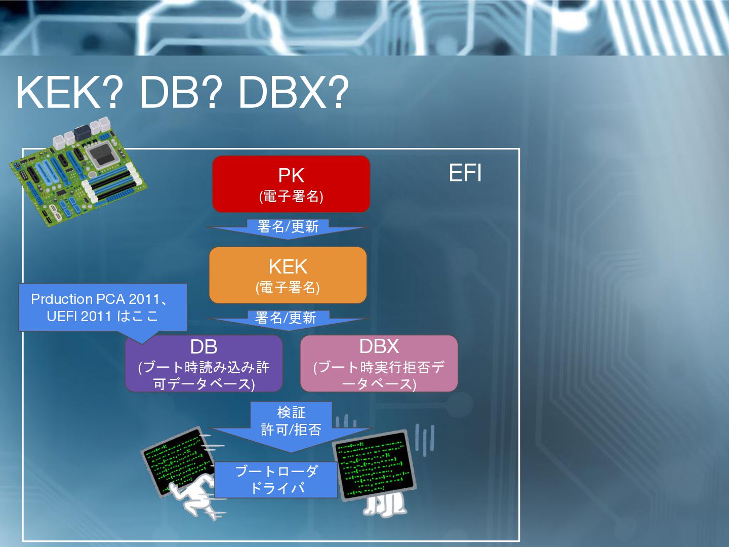 ドライバ 検証 許可/拒否 KEK (電子署名) 署名/更新 EFI PK (電子署名) 署名/更新 Prduction PCA 2011、 UEFI 2011 はここ