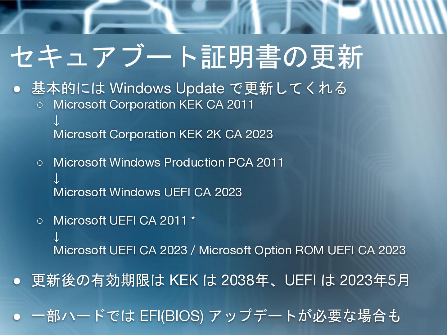 CA 2011 ↓ Microsoft Corporation KEK 2K CA 2023 ◦ Microsoft Windows Production PCA 2011 ↓ Microsoft Windows UEFI CA 2023 ◦ Microsoft UEFI CA 2011 * ↓ Microsoft UEFI CA 2023 / Microsoft Option ROM UEFI CA 2023 • 更新後の有効期限は KEK は 2038年、UEFI は 2023年5月 • 一部ハードでは EFI(BIOS) アップデートが必要な場合も