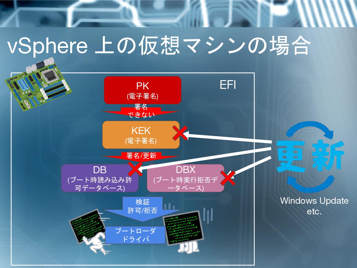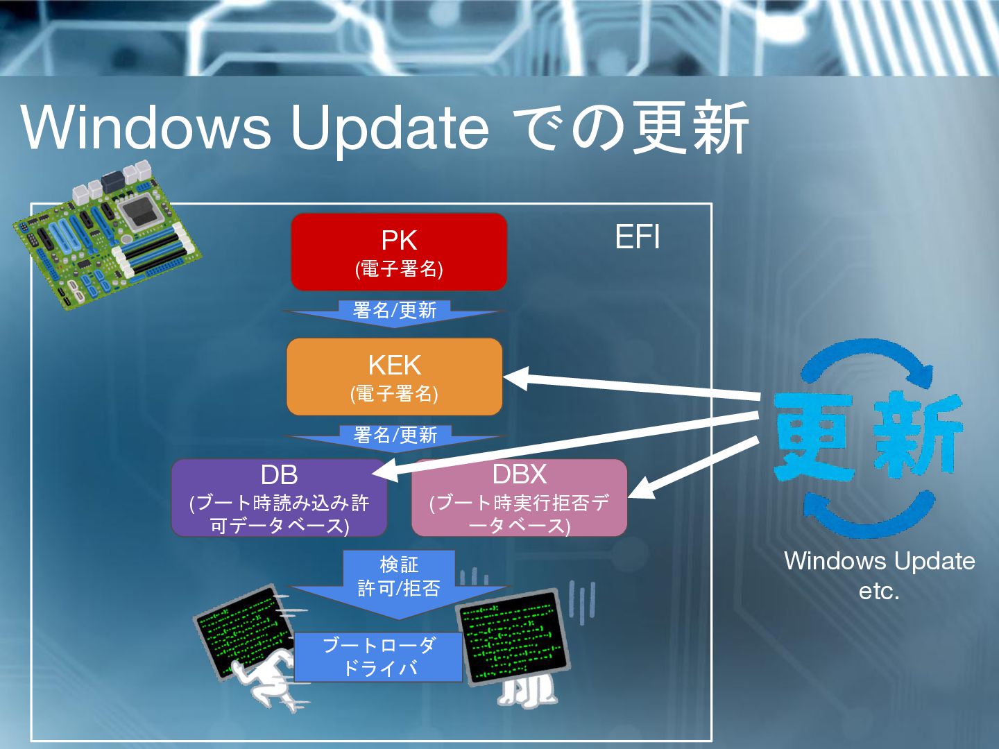 ドライバ 検証 許可/拒否 KEK (電子署名) 署名/更新 EFI PK (電子署名) 署名/更新 Windows Update etc.