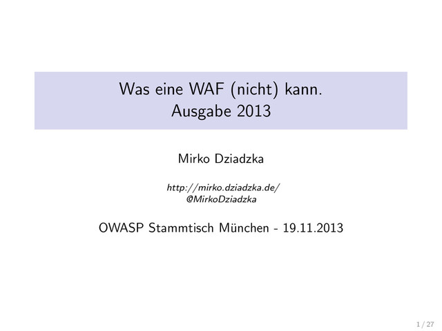 deklariert) kaputtes / fehlendes Encoding Kunde: aber ohne die WAF geht es doch Wie und wie oft dekodiert die Applikation die Daten? Was soll denn die WAF jetzt genau unsersuchen? WAF muss Applikation verstehen 19 / 27