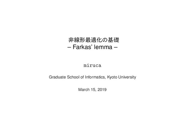 of Farkas’ lemma ূ໌. K = C⋆ ʹର͢Δূ໌ (1) K ⫅ C⋆ (2) C⋆ ⫅ K ͷೋஈ֊Ͱߦ͏ɽ (1) ҙͷ y ∈ K ʹରͯ͠ɼy ∈ C⋆ Ͱ͋Δ͜ͱΛࣔ͢ɽy ∈ K Ͱ ͋Δ͔Βɼҙͷ x = ∑ m i=1 αiai ∈ C ʹରͯ͠ɼ ⟨x, y⟩ = ⟨ m ∑ i=1 αiai, y ⟩ = m ∑ i=1 αi ⟨x, y⟩ ≦ 0 ͕Γཱͭɽ͜Ε y ∈ C⋆ Λҙຯ͍ͯ͠ΔͷͰɼK ⫅ C⋆ ͕ࣔ͞ Εͨɽ(2) ҙͷ y ∈ C⋆ ʹରͯ͠ɼy ∈ K Ͱ͋Δ͜ͱΛࣔ͢ɽۃ ਲ਼ C⋆ ͷఆٛΑΓɼҙͷ x ∈ C ʹରͯ͠ɼ ⟨y, x⟩ = ⟨ y, m ∑ i=1 αiai ⟩ = m ∑ i=1 αi ⟨ y, ai ⟩ ≦ 0 (11) ͕Γཱͭɽ͜͜Ͱɼαi ≧ 0 (i = 1, . . . , m) ҙͰ͋Δɽ 14 / 20