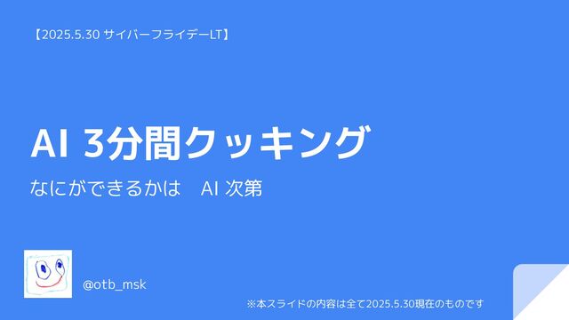 AI 3分間クッキング なにができるかは AI 次第 @otb_msk ※本スライドの内容は全て2025.5.30現在のものです 【2025.5.30 サイバーフライデーLT】