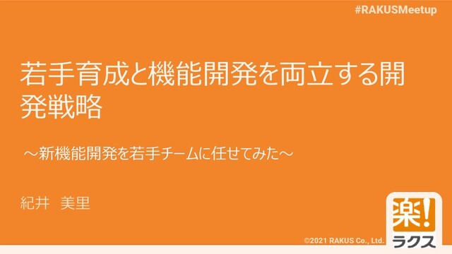 ©2021 RAKUS Co., Ltd. #RAKUSMeetup 若手育成と機能開発を両立する開 発戦略 紀井 美里 〜新機能開発を若手チームに任せてみた〜
