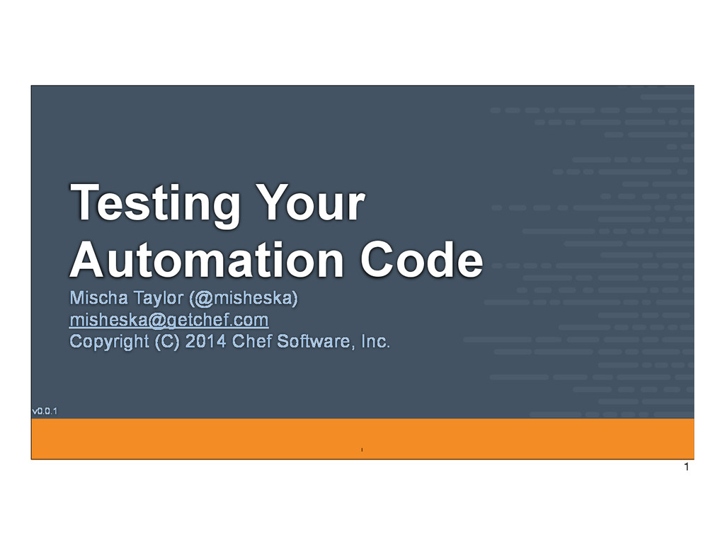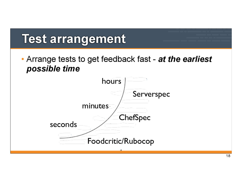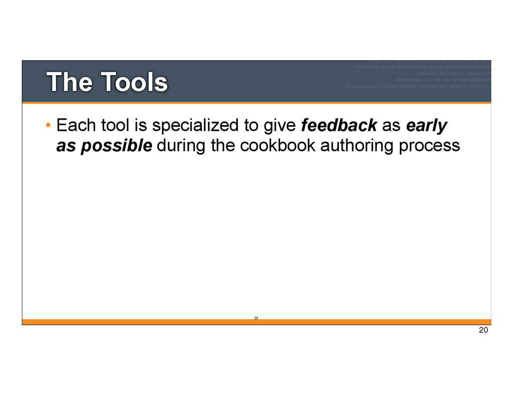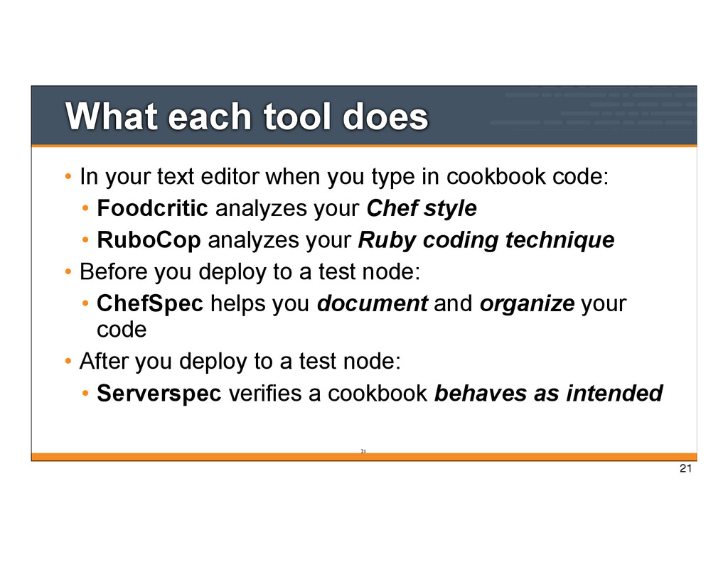 you type in cookbook code: • Foodcritic analyzes your Chef style • RuboCop analyzes your Ruby coding technique • Before you deploy to a test node: • ChefSpec helps you document and organize your code • After you deploy to a test node: • Serverspec verifies a cookbook behaves as intended 21 21