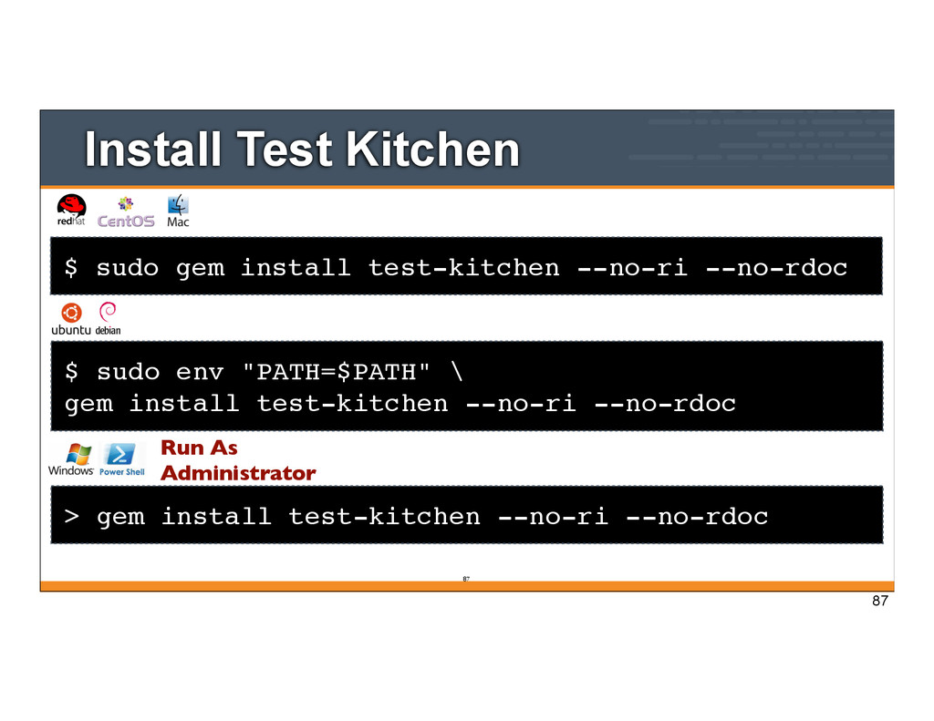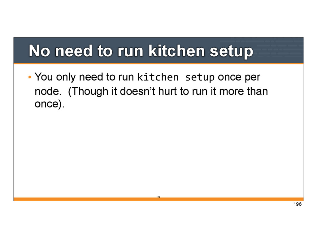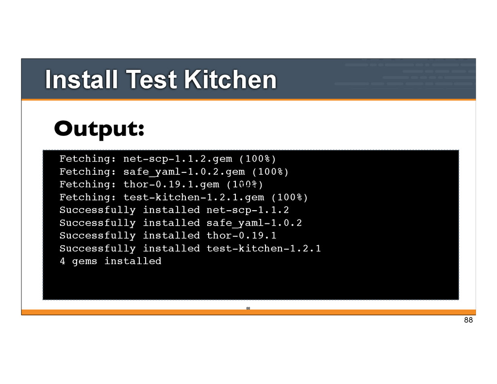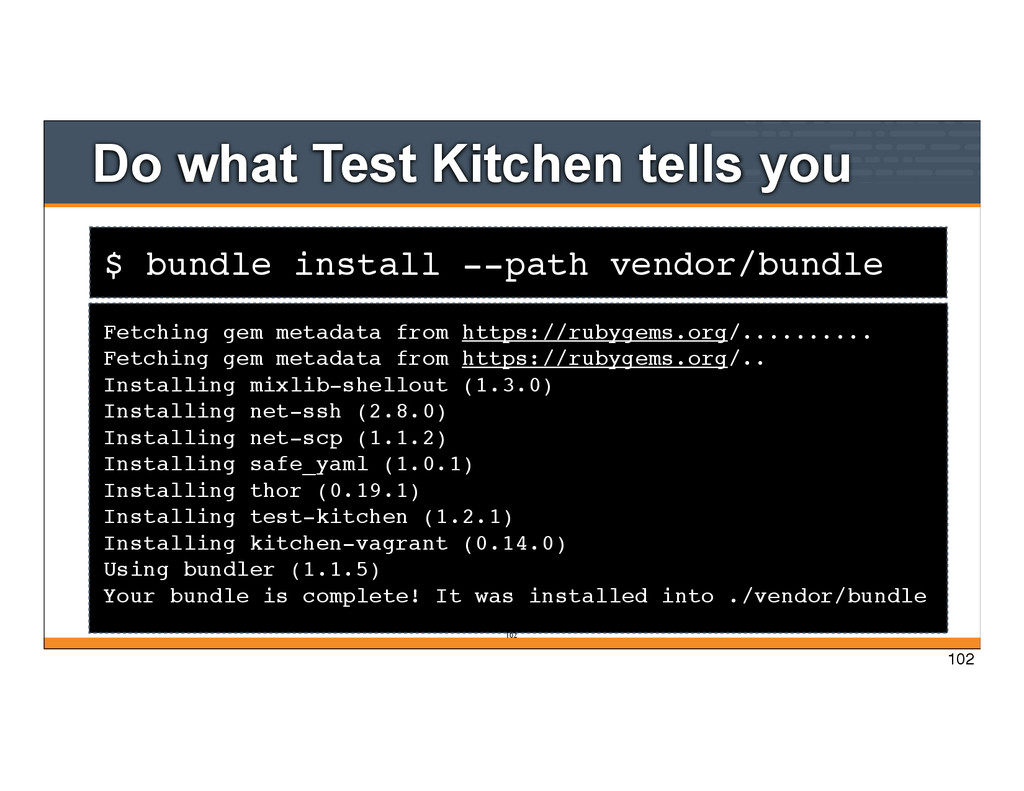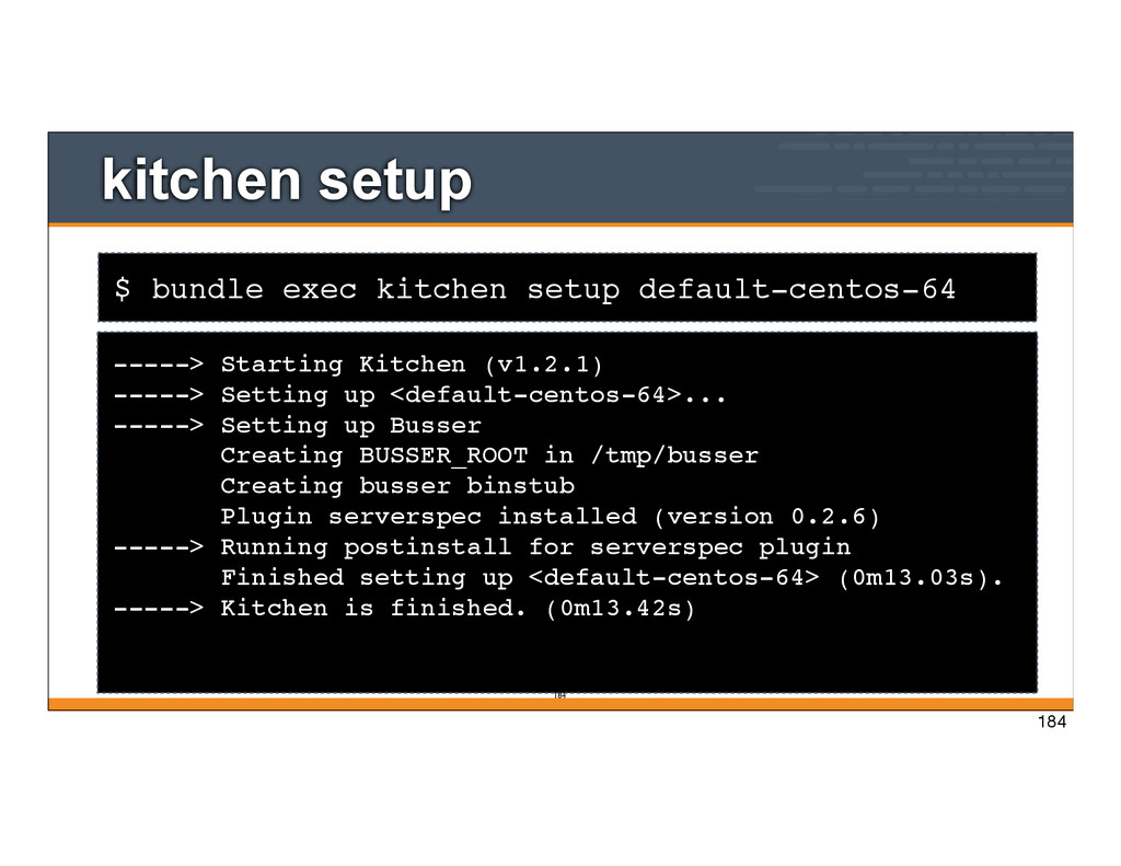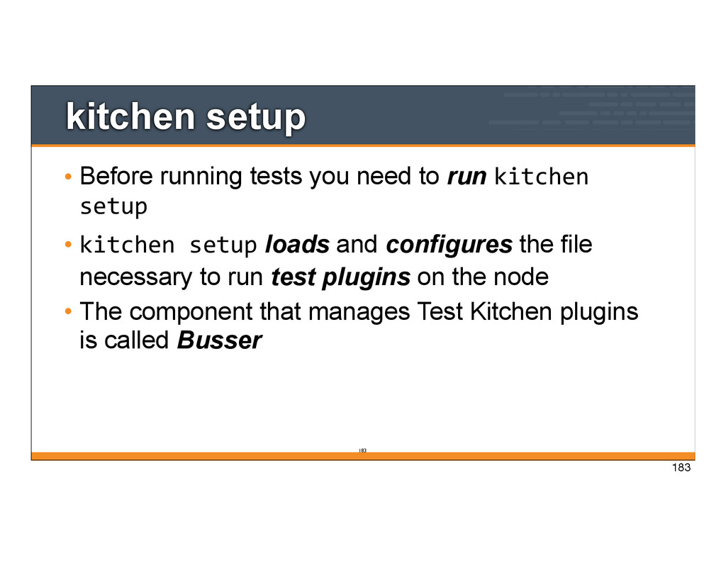 run kitchen setup • kitchen setup loads and configures the file necessary to run test plugins on the node • The component that manages Test Kitchen plugins is called Busser 183