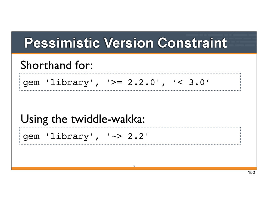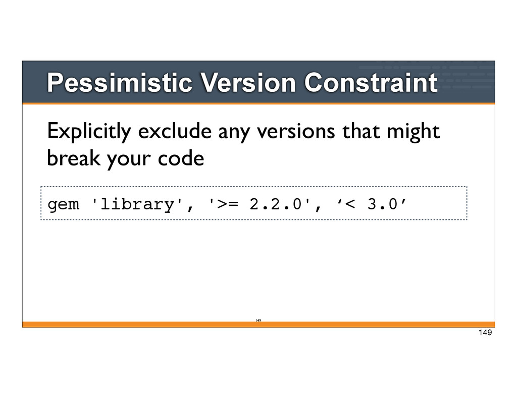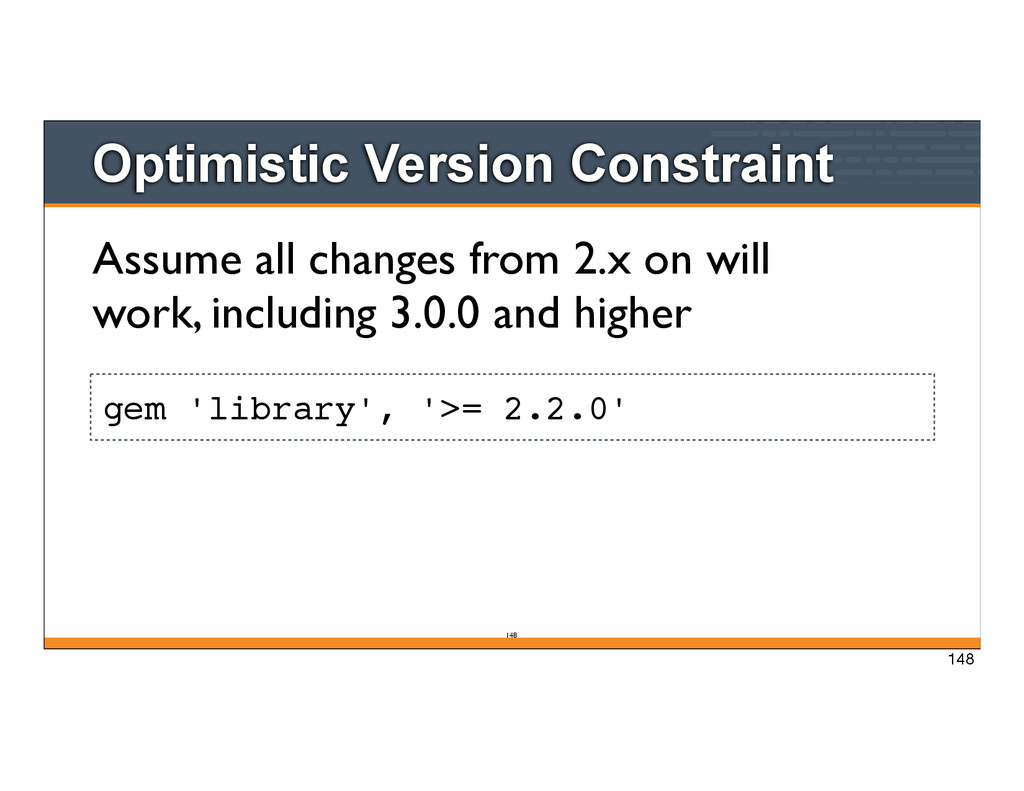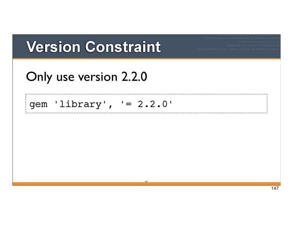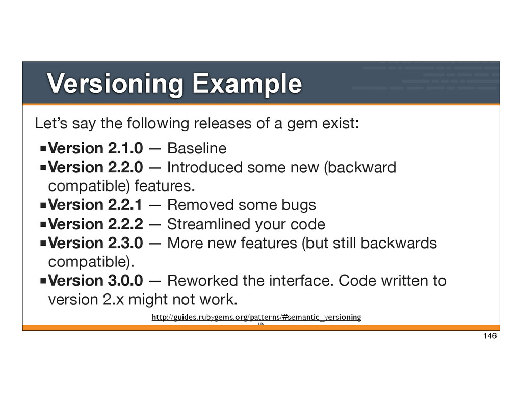 gem exist: ▪Version 2.1.0 — Baseline ▪Version 2.2.0 — Introduced some new (backward compatible) features. ▪Version 2.2.1 — Removed some bugs ▪Version 2.2.2 — Streamlined your code ▪Version 2.3.0 — More new features (but still backwards compatible). ▪Version 3.0.0 — Reworked the interface. Code written to version 2.x might not work. http://guides.rubygems.org/patterns/#semantic_versioning 146