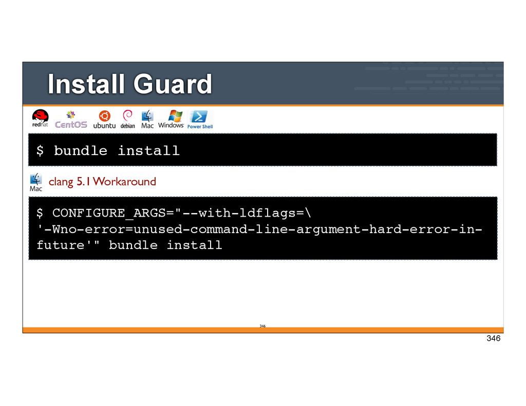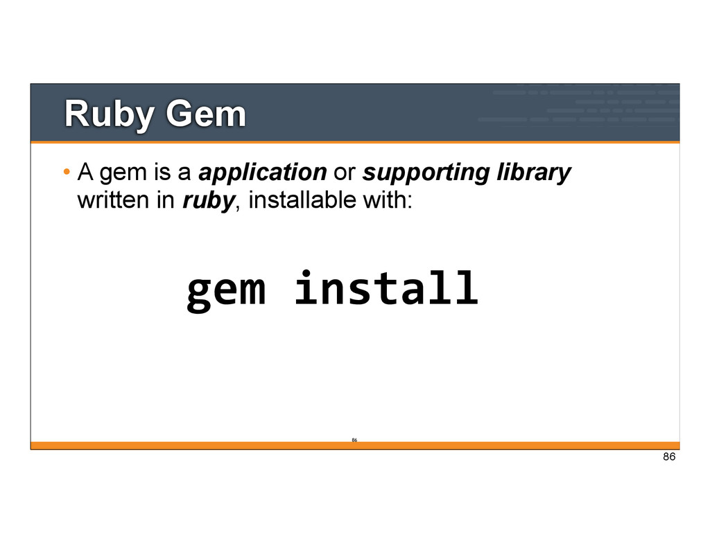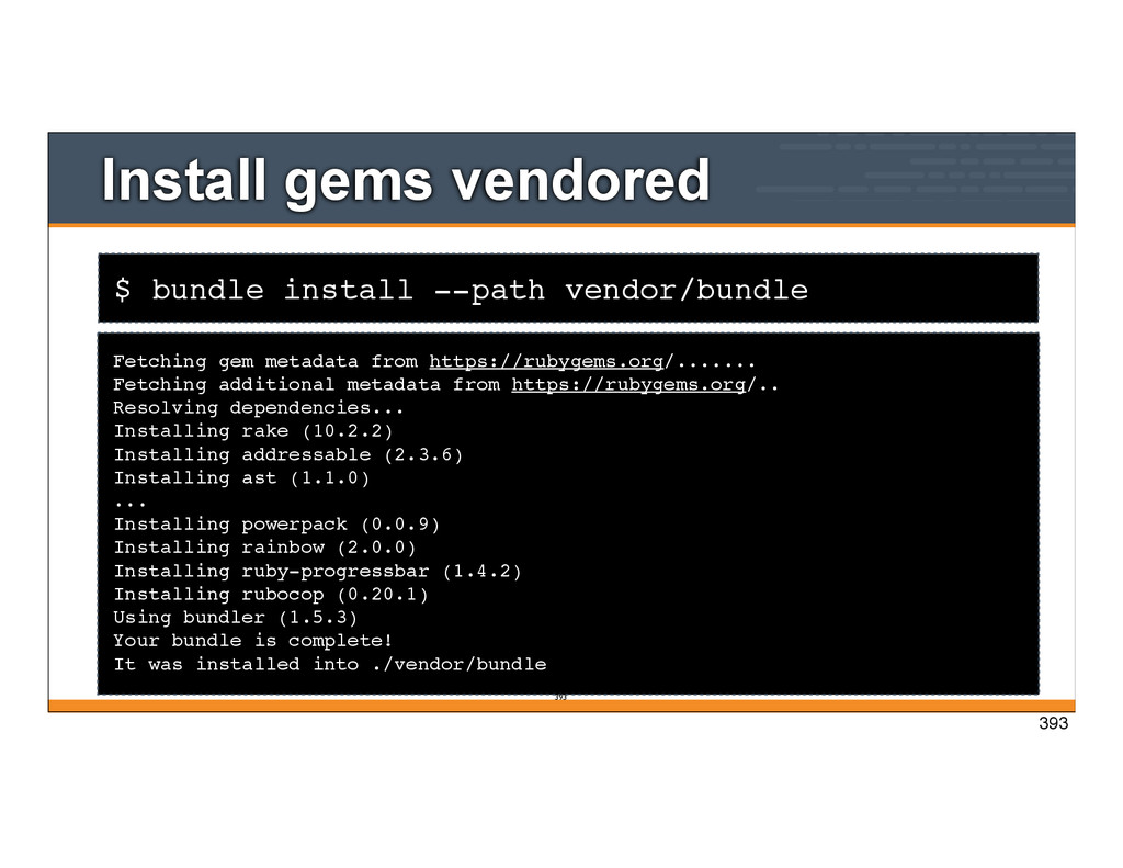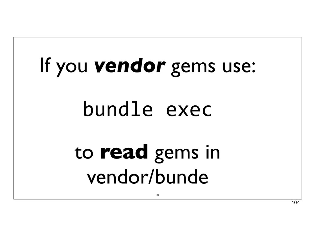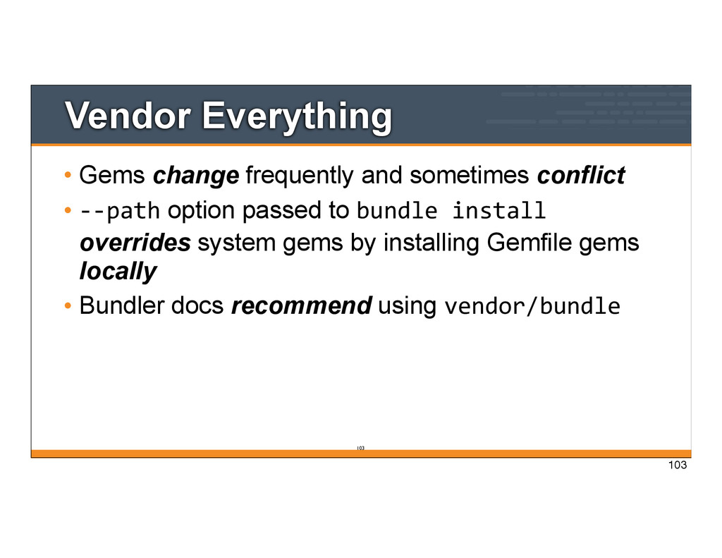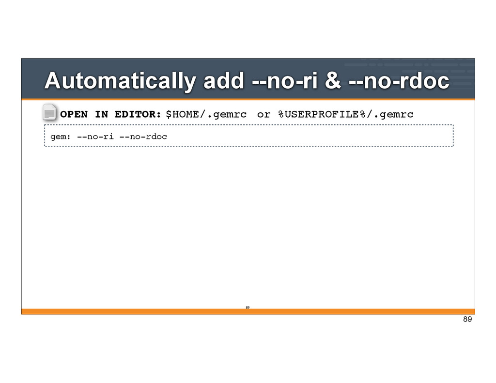 gem exist: ▪Version 2.1.0 — Baseline ▪Version 2.2.0 — Introduced some new (backward compatible) features. ▪Version 2.2.1 — Removed some bugs ▪Version 2.2.2 — Streamlined your code ▪Version 2.3.0 — More new features (but still backwards compatible). ▪Version 3.0.0 — Reworked the interface. Code written to version 2.x might not work. http://guides.rubygems.org/patterns/#semantic_versioning 146