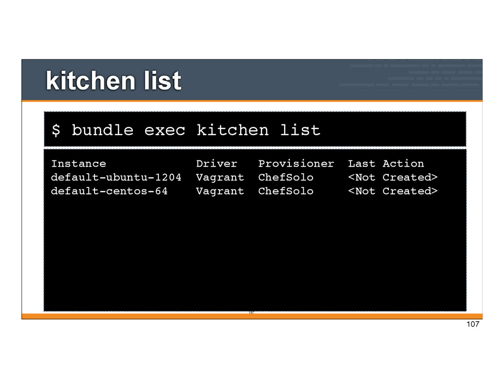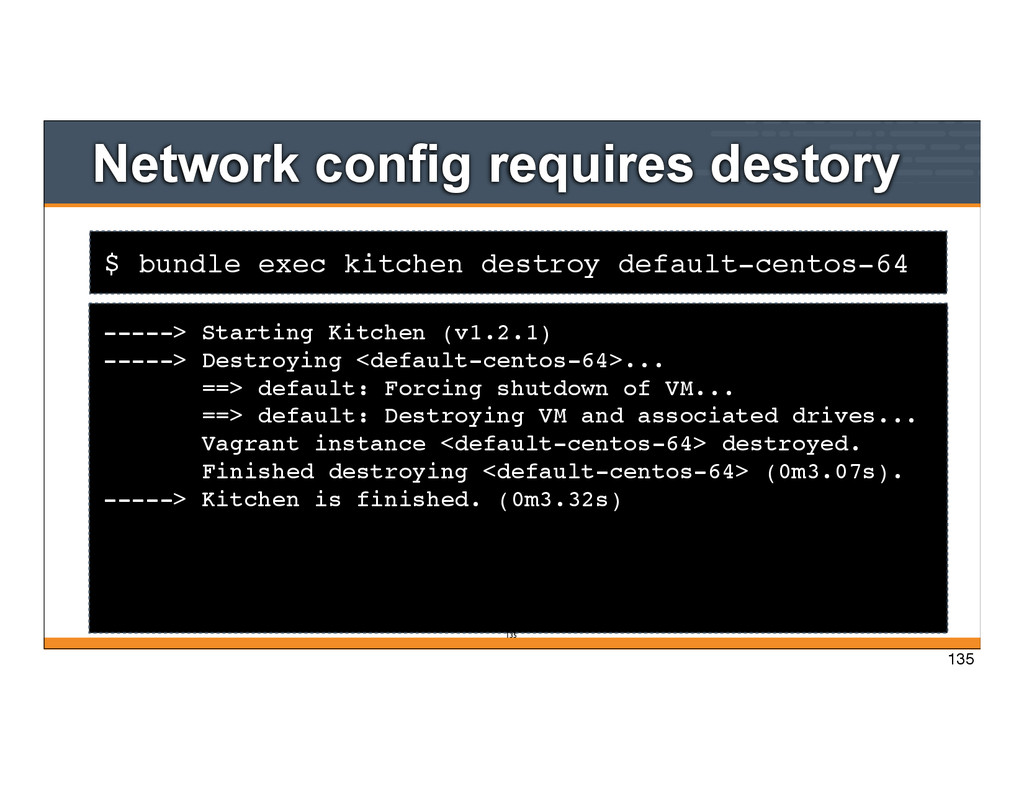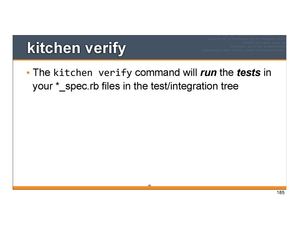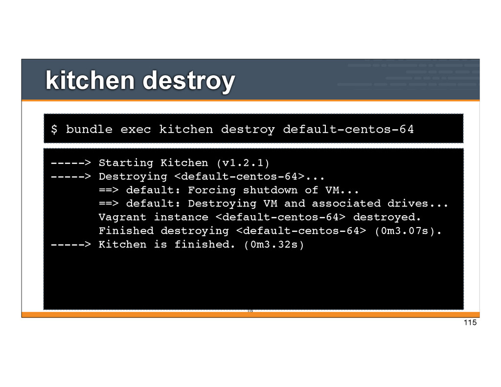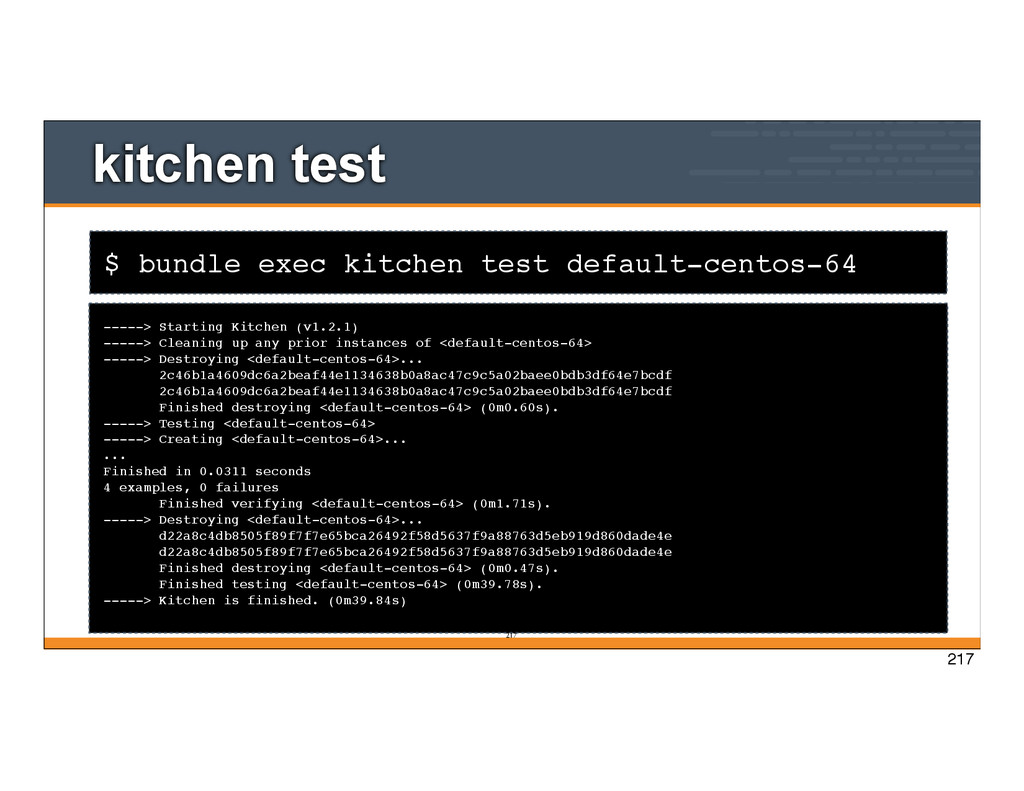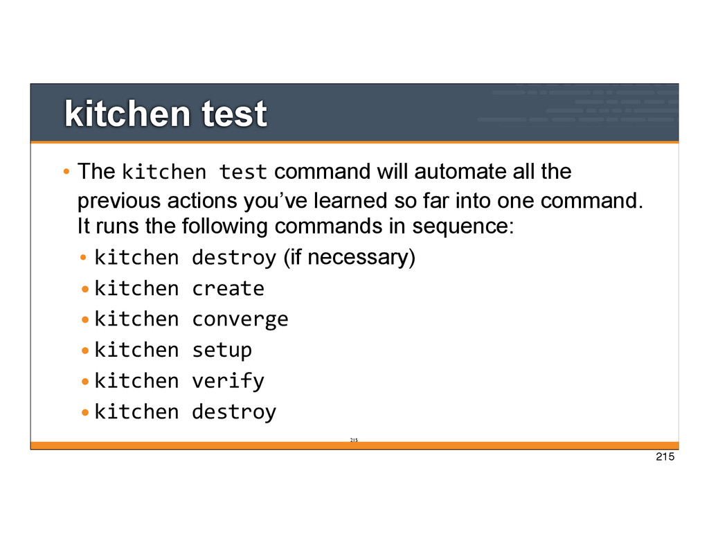 all the previous actions you’ve learned so far into one command. It runs the following commands in sequence: • kitchen destroy (if necessary) •kitchen create •kitchen converge •kitchen setup •kitchen verify •kitchen destroy 215