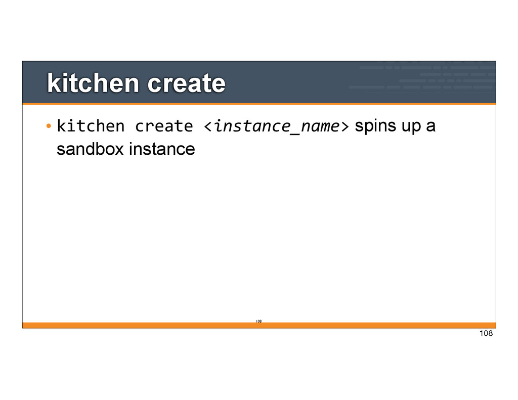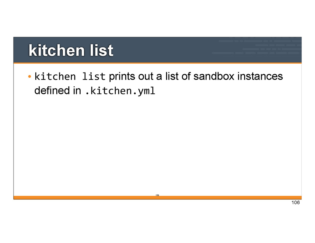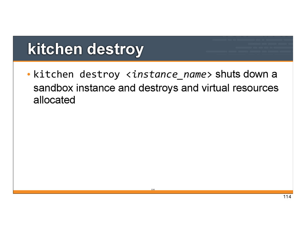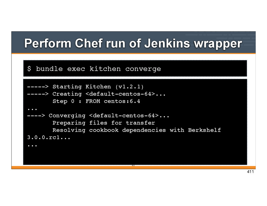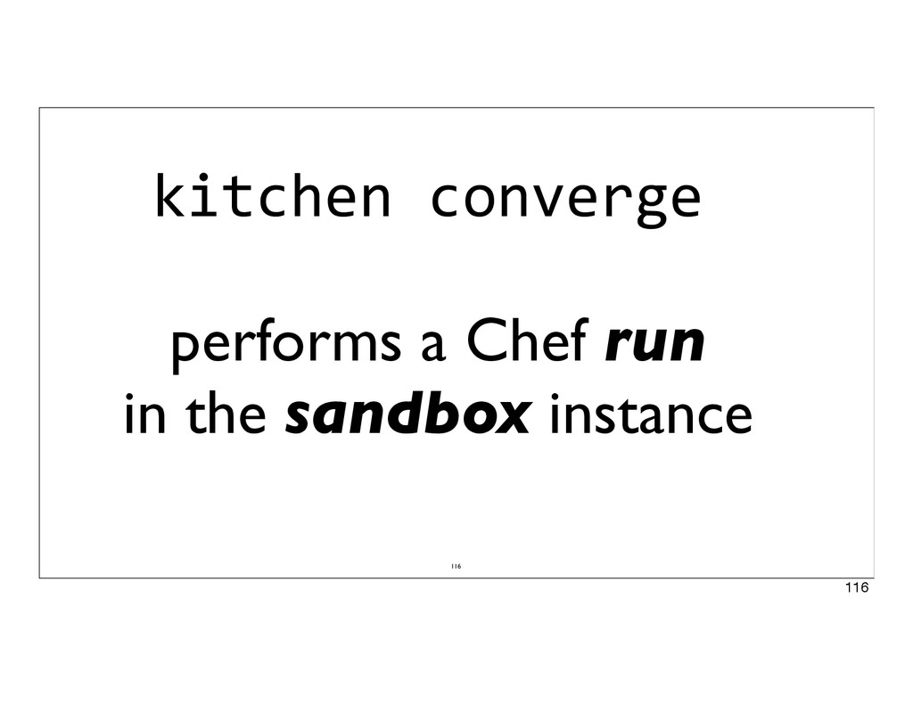 all the previous actions you’ve learned so far into one command. It runs the following commands in sequence: • kitchen destroy (if necessary) •kitchen create •kitchen converge •kitchen setup •kitchen verify •kitchen destroy 215