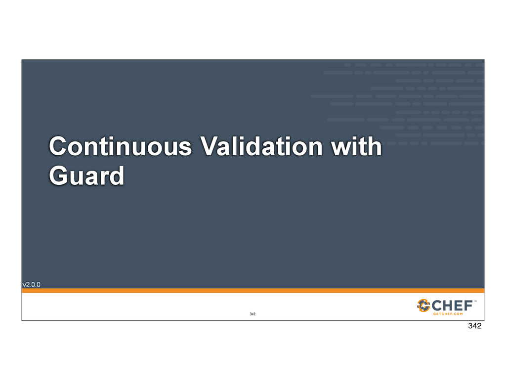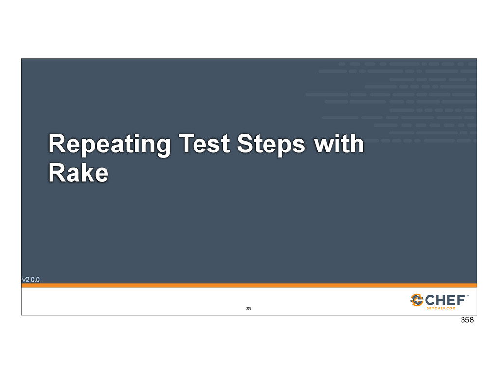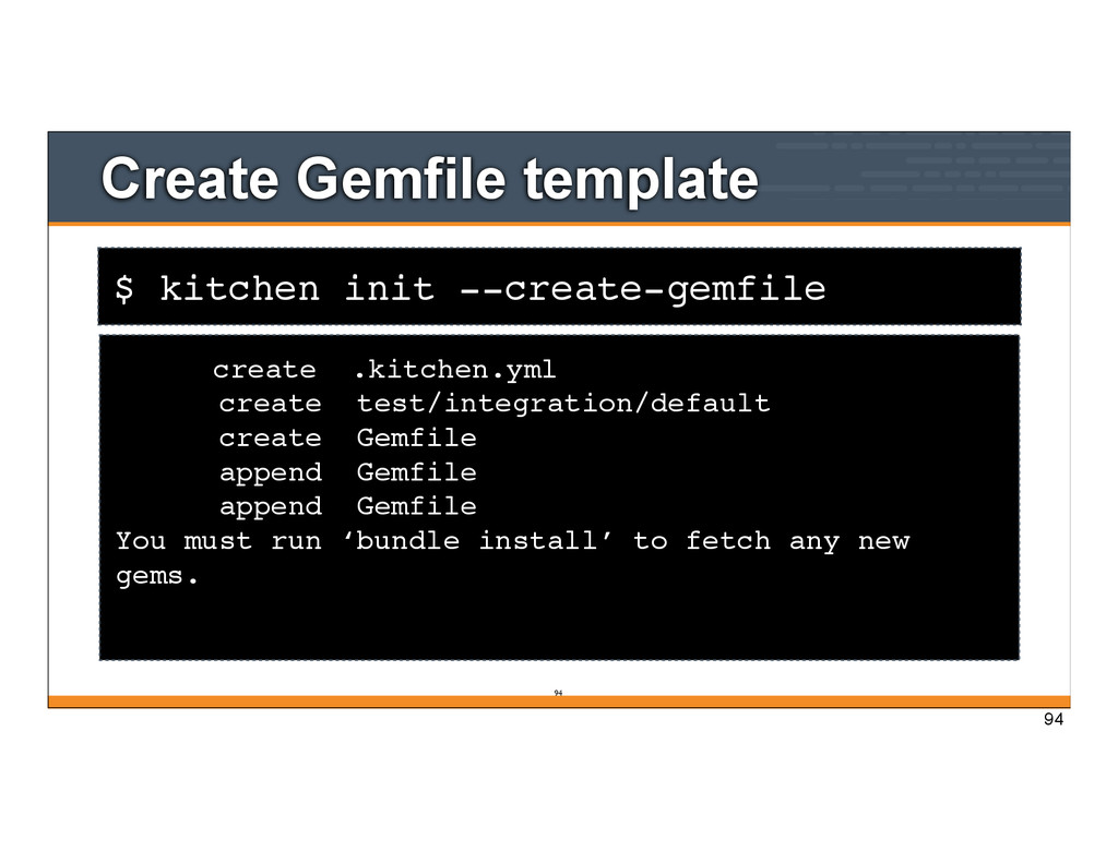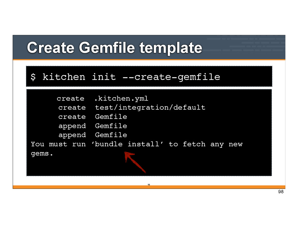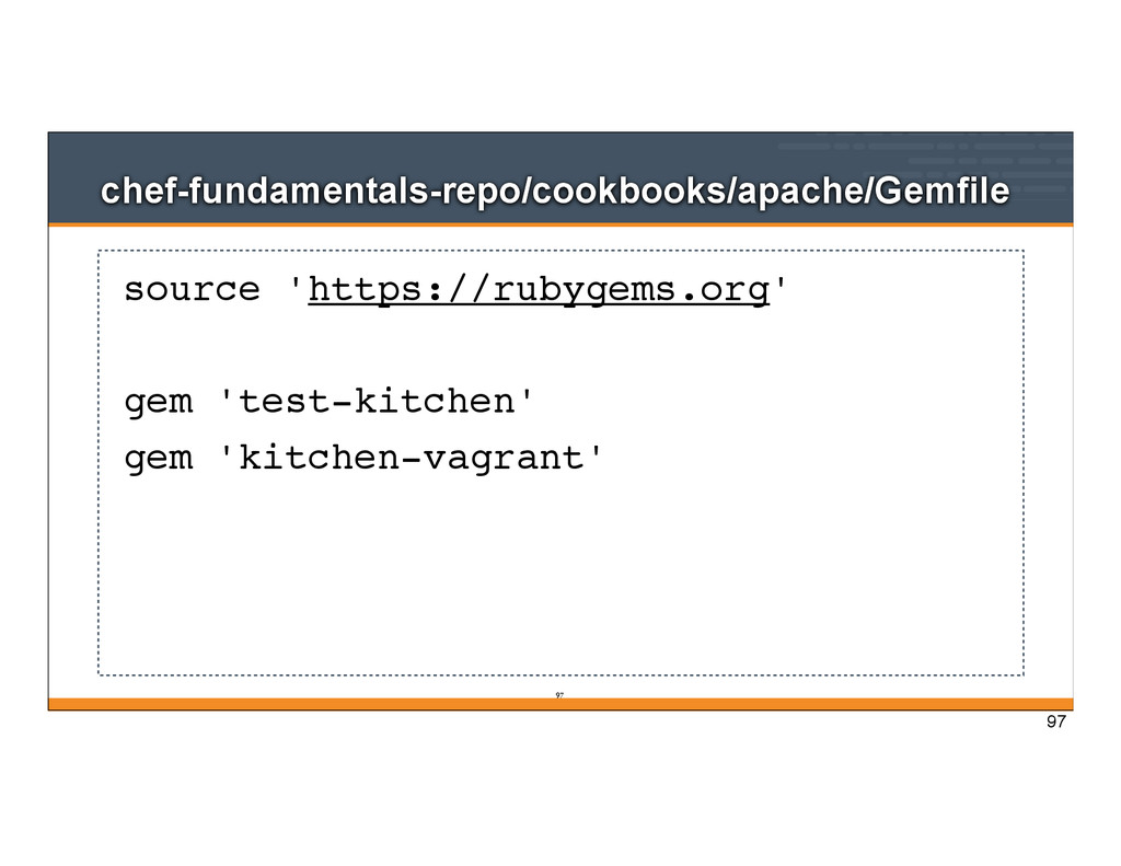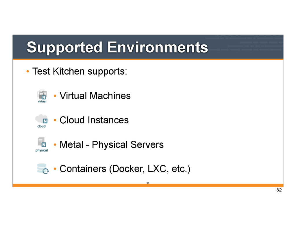 all the previous actions you’ve learned so far into one command. It runs the following commands in sequence: • kitchen destroy (if necessary) •kitchen create •kitchen converge •kitchen setup •kitchen verify •kitchen destroy 215