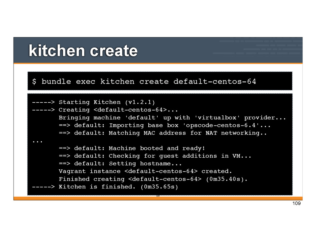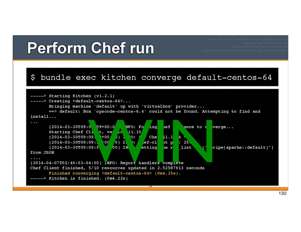 Starting Kitchen (v1.2.1) -----> Creating <default-centos-64>... Bringing machine 'default' up with 'virtualbox' provider... ==> default: Box 'opscode-centos-6.4' could not be found. Attempting to find and install... ... [2014-03-30T09:09:59+00:00] INFO: Forking chef instance to converge... Starting Chef Client, version 11.10.4 [2014-03-30T09:09:59+00:00] INFO: *** Chef 11.10.4 *** [2014-03-30T09:09:59+00:00] INFO: Chef-client pid: 2542 [2014-03-30T09:09:59+00:00] INFO: Setting the run_list to ["recipe[apache::default]"] from JSON .... [2014-04-07T02:40:03-04:00] INFO: Report handlers complete Chef Client finished, 5/10 resources updated in 2.52587913 seconds Finished converging <default-centos-64> (0m4.15s). -----> Kitchen is finished. (0m4.22s) 130 WIN 130